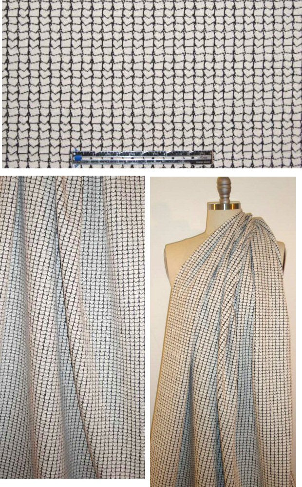 This fabulous-looking cotton blend novelty knit has an overlapping square "post-it" graphic design in black and ivory (PANTONE 11-4301). It is yarn-dyed, not printed, has 10% stretch in the width, 10% in the length, and a soft drape with some body. The weight is similar to a doubleknit or ponte and it's an opaque matelasse' construction (the back is not meant to be seen). It's a fabulous design that is perfect for any number styles that call for ponte or doubleknit: knit top and tunic styles, a fitted cardigan, knit dress or skirt, leggings, etc. Manufacturer recommends hand or machine wash in cold water, hang or lay flat to dry.
