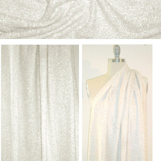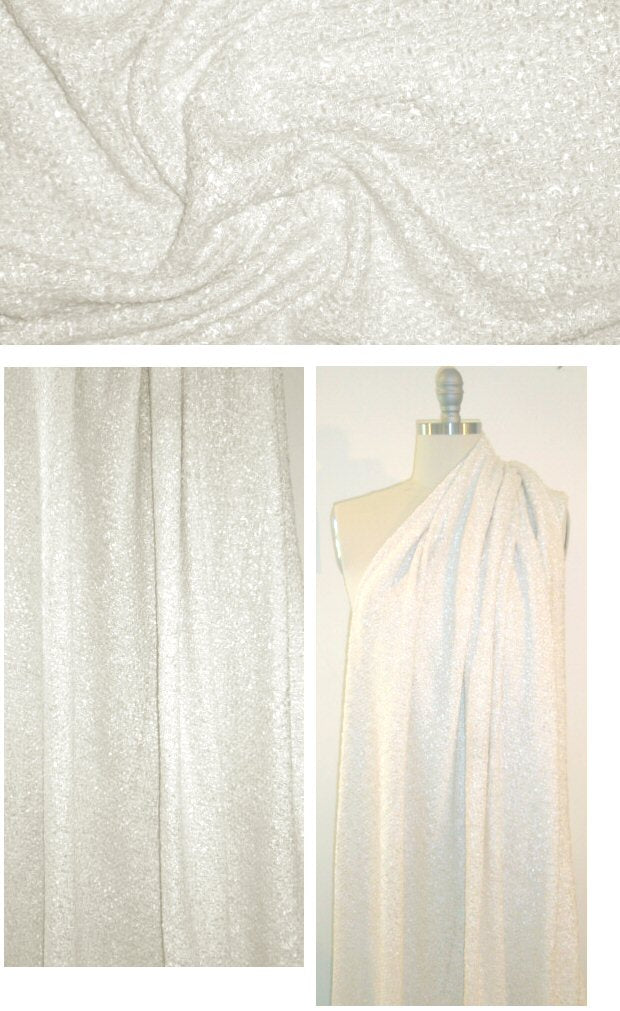 This is a stunning viscose blend boucle' tweed, Chane1-style, with an exquisite creamy white tonality. It has a hand-loomed appearance with fibers of varying thicknesses and textures woven in an intricate basketweave. A malleable suiting weight with lovely drape and body, suitable for jackets, suits, skirt, etc. Dry cleaning recommended.