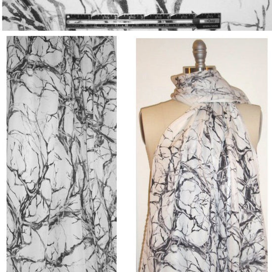 From Haute Hippie, this is an exquisite silk georgette print (called "heavy georgette"), semi-sheer and floaty with an amazing "trees in winter" print in black and white (68" repeat). Perfect for billowy blouses, tops, dress, tunic, scarf, dress, gown, etc. Some styles 2ill need lining or layering. Dry cleaning recommended, but test first if you wish to hand wash.