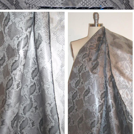 This is a fabulous reversible brocade from R0darte, made in Italy, medium weight with a very crisp drape. One side has a more shiny, reflective sheen, almost like a lamination, and the other side has a blend of matte and reflective qualities. The jacquard weave reverses coloring, but both sides feature shades of silvery gray (not metallic) in a woven-in python design (PANTONE 16-0000, 14-4002, etc.). It has a very tight weave and an ultra-smooth finish. Use for an architectural, avant garde coat or jacket. Dry cleaning recommended. (Great price!!)