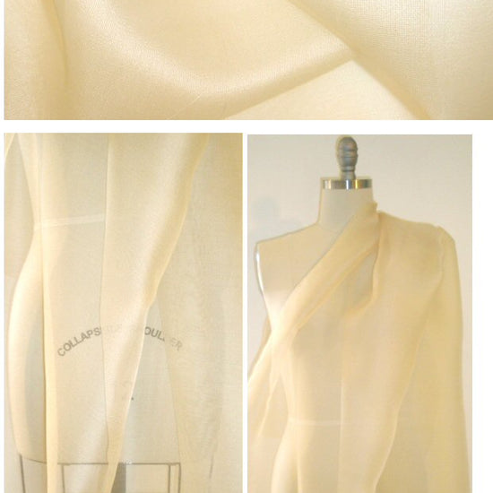 This is an exquisite all-silk tulle netting in a pale butter tone (PANTONE 12-0712), very sheer with a crisp drape. So pretty and feminine, perfect for any project that calls for tulle. 1.125 yds.