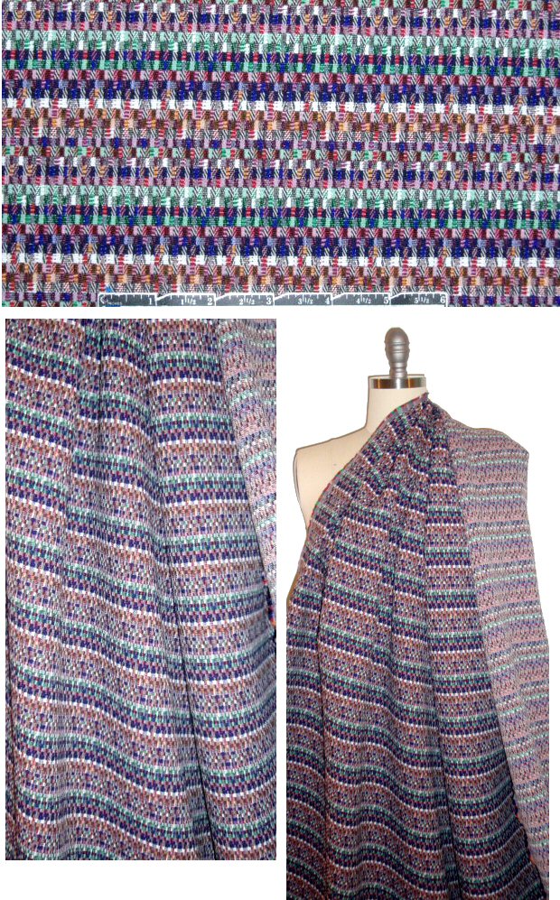 Just in with a shipment from French mills, this jacquard brocade has a beautiful woven-in mini-mosaic design in purple, red, kelly, white, peach, etc. (PANTONE 19-3842, 19-1862, 16-5431, etc.). It is a suiting/coating weight with body in the drape, and the overall coloring is lighter on the opposite side. Make a tailored jacket, topper coat, vest, tapestry bag, fitted skirt, etc. Dry cleaning recommended. 1.5 yds.