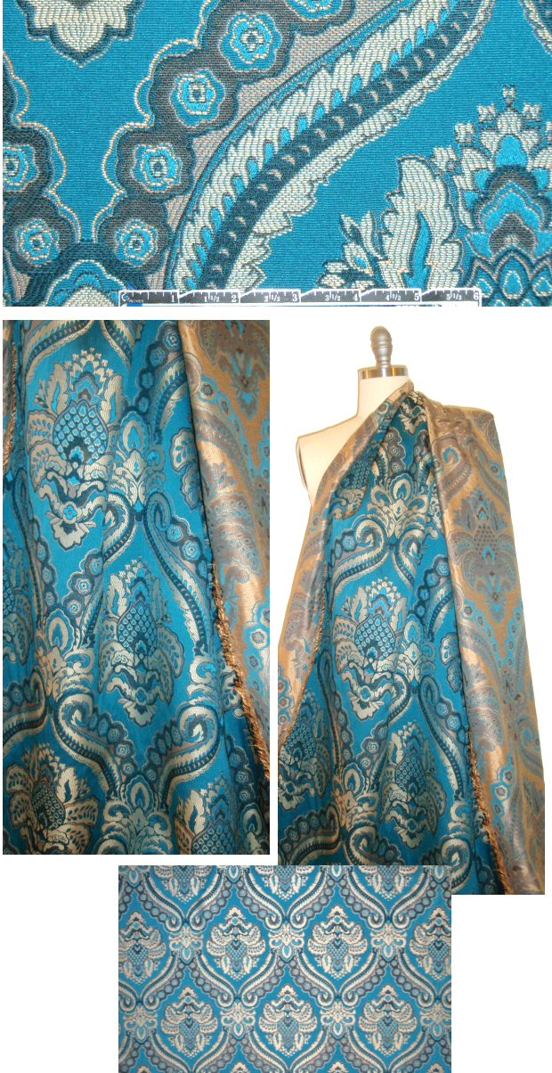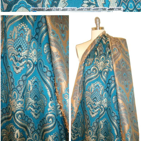 From A1ice & 0livia, this is a bold and wonderful jacquard brocade, a medium suiting weight, opaque with a good amount of body in the drape. It has a woven-in, large ornate medallion design with a 22" vertical and 14" horizontal repeat. The fiber colors are teal-blue, black and champagne gold (PANTONE 18-4432, 14-1110). The colors reverse on the opposite side, which I attempt to show below. While it is not reversible, the wrong side is pretty and can be used as contrast. Perfect for a special occasion jacket or coat. Dry cleaning recommended. 1.5 yds.