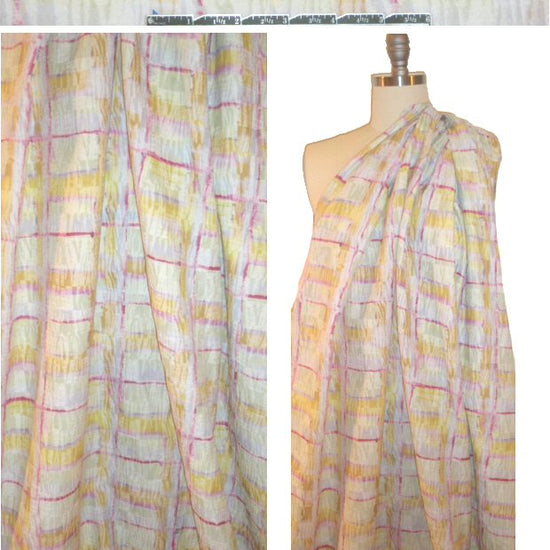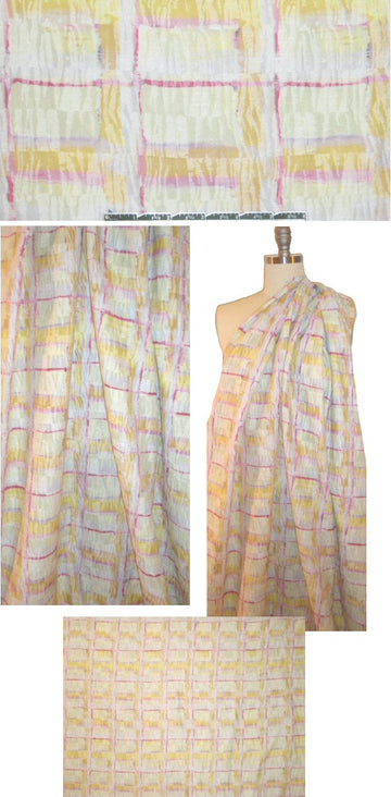 This is a very unique, intriguing and beautiful fabric! From Sun0, it is a 2-ply, lightly textured white fabric with a streaky, puckery effect, semi-opaque with a crisp organza-like drape (but it's not as thin as organza). It is over-printed with a grid-like, window-pane-ish design in pale green, maize, magenta and iris (PANTONE 12-0521, 17-2627, 14-0837...ish), but the dyes in the print react differently to the different fibers to create an ethereal gestalt effect. The print has a 14" vertical and 8" horizontal repeat. Try a top, shirt, blouse, tunic, skirt, dress, etc. Some styles will need lining or layering. Dry cleaning is probably best, or if you want to try hand-washing, please test first. 1.5 yds.