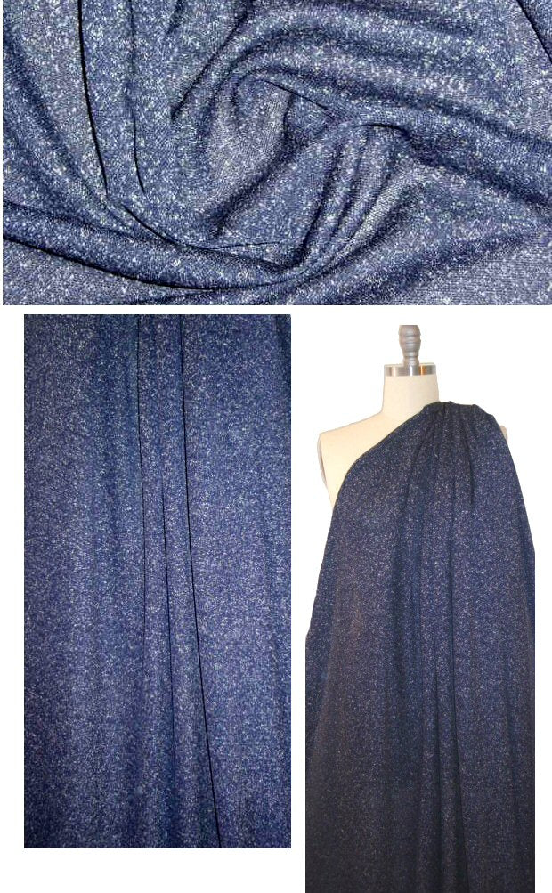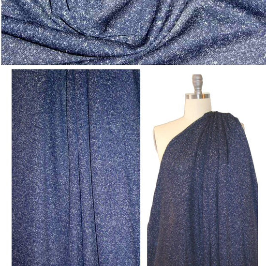 This is a fantastic all viscose sweater knit just in from a NY designer, made in Italy, medium-light weight, semi-opaque, smooth and drapey. It has a distinctive hand and knit stitch that is almost like a micro-honeycomb. It's a wonderful all-purpose sweater knit with 20% stretch in the width, stable in the length. The colors are denim-y navy and white (PANTONE 19-4014) in a tweedy melange. Make any number of tops, tunics, cardigans, pullovers, sweater dress, skirt, drawstring pants, etc. Dry clean, or if you wish to try hand- or machine-washing please test first, and lay flat to dry. 1.625 yds.