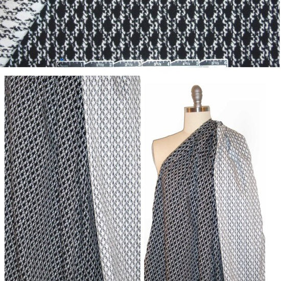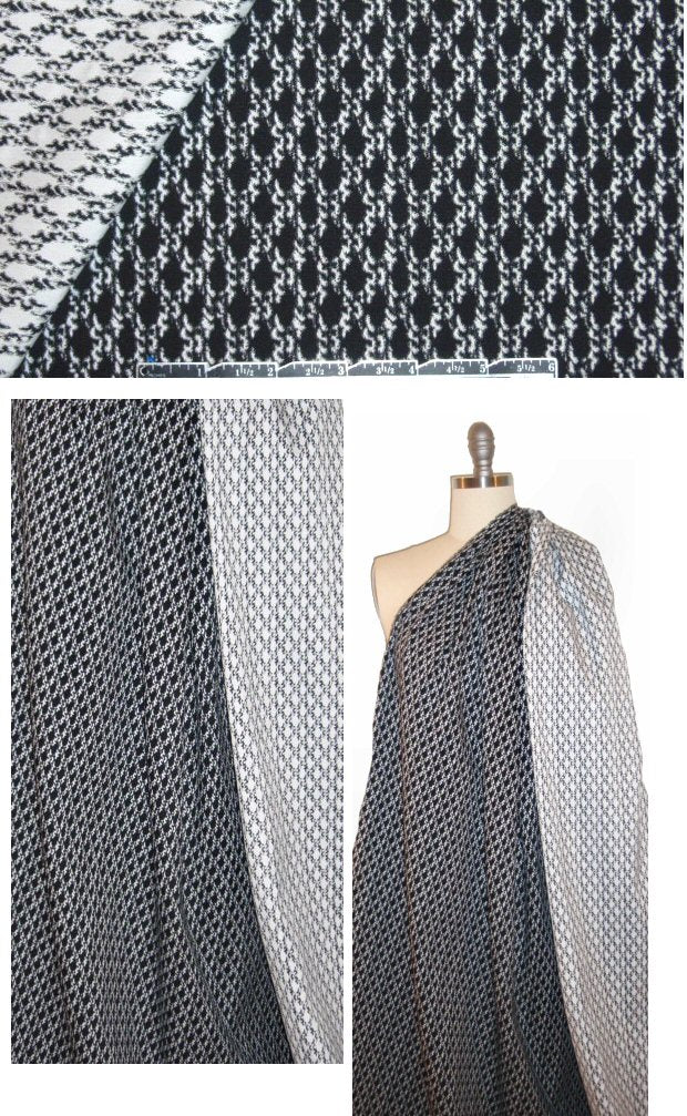 This is a gorgeous quality Japanese reversible stretch jacquard suiting (10% widthwise stretch), a cotton blend that has a malleable, cottony drape with some body. The graphic chain link design in black and white stone is sophisticated and versatile. Both sides are pretty, and I've attempted to show them below. It's a medium weight suiting, perfect for a fabulous fitted ladies jacket or topper coat, skinny pants, pencil skirt, fitted dress, etc. Dry clean or test first if you want to try hand or machine washing. Hang to dry. 1.625 yds.