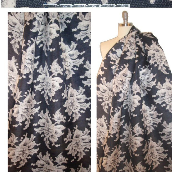 A stunning beauty from Car0lina H., made Italy, this is a printed silk gazar that has a lacey floral motif with a honeycomb mesh background (11" repeat). Please note that the background mesh is printed on.... it is not actually a mesh--it's a gazar. The colors are off white and midnight blue (PANTONE 19-4025, etc.). The fabric has an exquisitely fine basketweave with a firm and architectural drape. It is just a little bit sheer, and is best for a "runway-ready" special occasion dress, skirt or jacket, etc. Dry cleaning recommended.