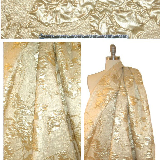 Oh my gosh... how to describe this exquisite silk cloque'! It is an Italian 2-ply beauty from a famous designer, and has a textured surface with a leafy motif. It is weightless and semi-sheer/semi-opaque with a crisp and light drape. The silk fibers look like gold leaf and have a gorgeous sheen, and they are woven together with very fine white nylon fibers to create this exquisite special occasion gem (PANTONE 14-0925 is in the vicinity). An haute couture beauty that is best for a very special evening garment. Dry clean only.