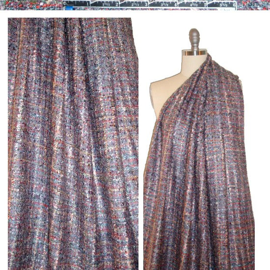 This is a stunning viscose boucle' tweed, Chanel-style, with an exquisite and vivid coloring including shades of persimmon, wisteria, blue smoke, dusty lavender, blush, etc. (PANTONE 17-1456, 16-4404, 18-3418, etc.). It has a hand-loomed appearance with fibers of varying thicknesses and textures woven in an intricate basketweave. A malleable suiting weight with lovely drape and body, suitable for jackets, suits, skirt, etc. Dry cleaning recommended. 1.375 yds.