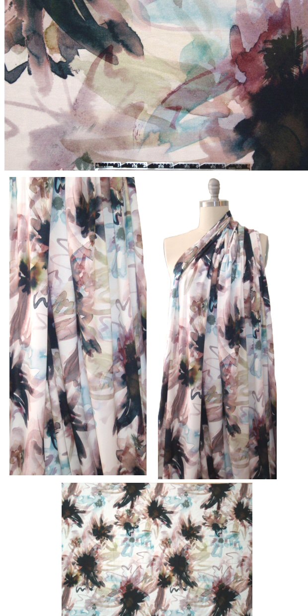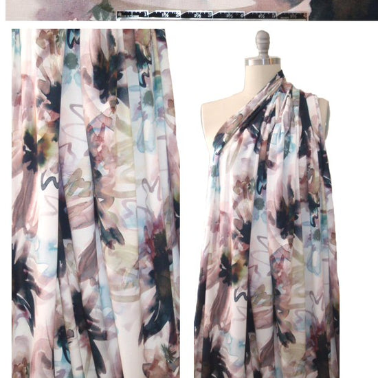 From a new shipment that just arrived from France, this is a fabulous viscose/lycra 4-way stretch knit, lightweight yet opaque, with lovely drape. The digital print is an inky watercolor floral abstract in glorious tones of deep teal and ivory, along with watery mauve-brown, sage, aqua, etc. (PANTONE 19-4316, 17-1505, 14-0615, 13-4404, etc.). 50% stretch in the width and length, with great recovery. Great for tees, tops, tunics, dresses, etc. Beautiful quality! Test first if you would like to hand or machine wash, and hang to dry. LAST PIECE, 1.125 yds.