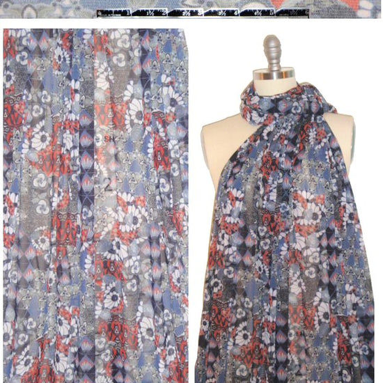 From a wonderful West Coast designer, this is a 4-way stretch mesh knit, with 150% widthwise, 30% lengthwise stretch. It is featherweight, semi-sheer and drapey with a micro-honeycomb texture. The print is a stylized flowery montage in smokey blue, dusty loden, nectarine, off white and midnight (PANTONE 17-3917, 17-0620, 18-1450, etc). Perfect as an overlay for tops, tunics, dresses, shawls, scarves, etc. and you can either double it or line it with power mesh to recreate your favorite RTW! Beautiful quality at a great price. Hand wash cold, hang to dry. 1.5 yds.