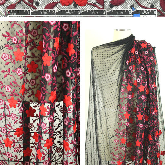 This is a wonderful dotted mesh with a 40" wide border extending out from one selvage, and an embroidered stylized flower design. The colors are red, wine and light pink on black (PANTONE 18-1662, 18-1619, 14-2307). You have options as to how to lay out and cut your garment depending on your design preferences. It has a flowing, soft drape and can be used as an overlay for a gorgeous special occasion tunic, top, dress, gown, shawl, etc. Dry clean, or test first if you wish to try hand-washing, and hang or lay flat to dry.