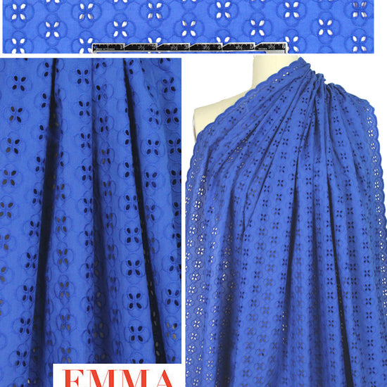 This lovely quality embroidered cotton eyelet has a modern interlocking flower graphic design with pretty scalloped selvages along each side. The base fabric is a lightweight, semi-sheer cotton and the color is cobalt blue (PANTONE 18-3945). It has a cottony drape and is perfect for a summery top, blouse, shirt, tunic, dress, skirt, etc. Some styles will need lining or layering. Hand wash and hang to dry.