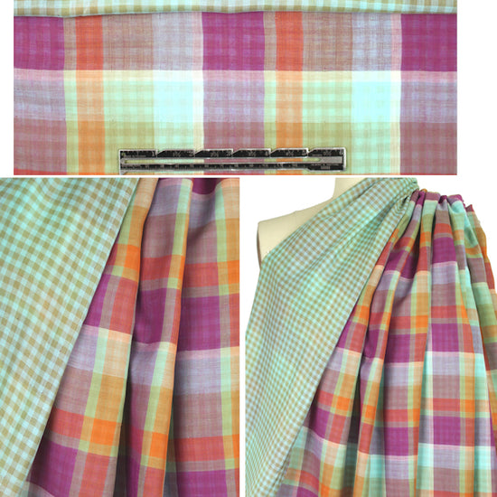 From a NY designer and made in France, this is a wonderful two-ply reversible cotton plaid/check woven with a small-scale check on one side and a larger scale plaid on the other (5.5" repeat). It's lightweight and drapey, semi-sheer with a "gauzy voile" texture. The coloring is gorgeous: interwoven shades of fuchsia, mint, tangerine, kelp, etc. (PANTONE 19-2630, 13-4909, 14-1227, 16-1210, etc.). Make a fabulous blouse or shirt, top, tunic, etc. Hand wash cold, hang or lay flat to dry (please test first!).