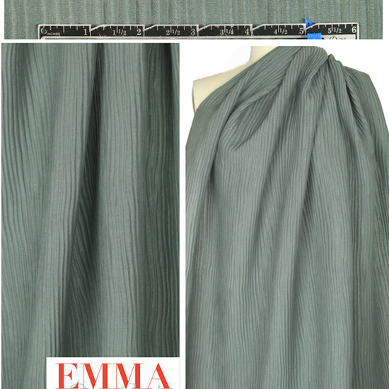A boho chic beauty, this is a tone on tone, rib-textured matelasse' weave with a raised wavy stripe pattern in a lovely grayish celadon color (PANTONE 16-5804). The fabric has a soft drape with some body, and although the texture makes it seem substantial, it has a weightless feel and is a teeny bit sheer. Both sides are lovely. Perfect for a top, tunic, blouse or shirt, dress, skirt, etc. Some styles may need lining. Dry cleaning recommended, or if you wish to try hand-washing please test first and hang or lay flat to dry.