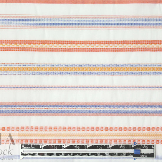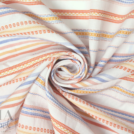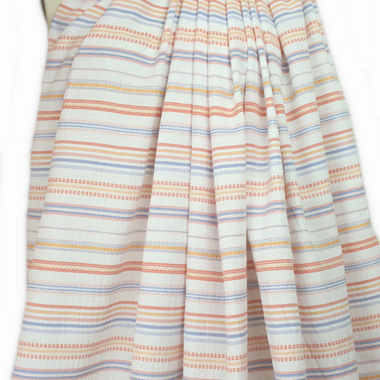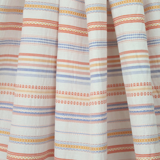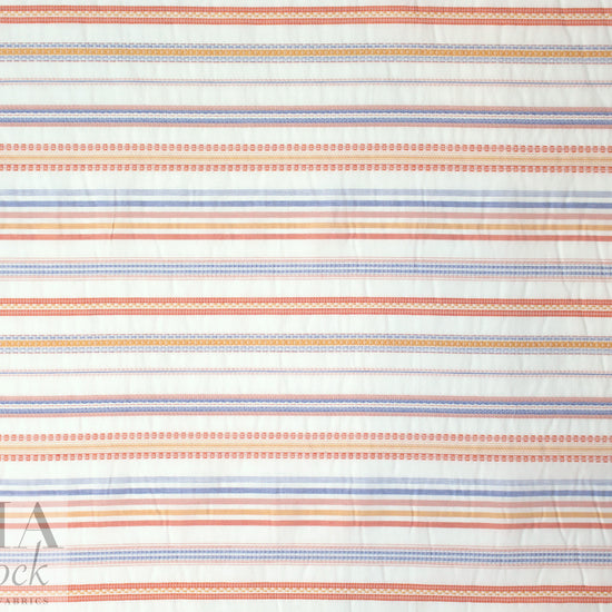 This is a lovely and summery yarn-dyed stripe cotton blend woven, with jacquard stripes on a shirting weight woven ground. The overall stripe repeat is 8" and the colors are tangerine, orange sorbet and chambray blue on white (PANTONE 16-1539, 13-1020, 18-3935). It is opaque with a cottony drape, and the stripes can be oriented widthwise or lengthwise, or mixed, for a number of fabulous looks! Try a shirt, top, blouse, tunic, dress, skirt, etc. Some styles will need lining or layering. Test first if you want to try hand- or machine-washing, and hang to dry. 1.625 yds.