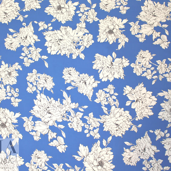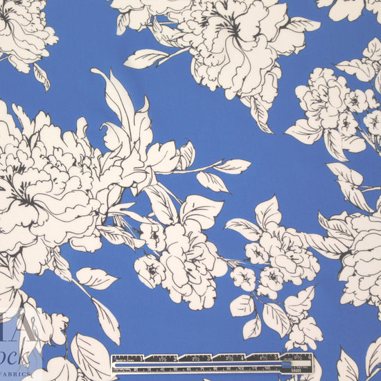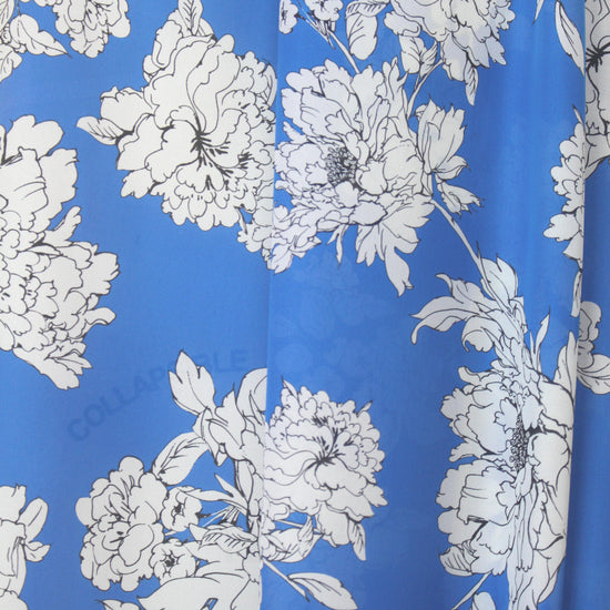 Just in with a collection from Mi11y, this is a wonderful silk georgette, lightweight, semi-sheer, with a flowing, soft drape and a slightly crepey texture. The floral print (38" repeat) features black and white flowery clusters on a blue background (PANTONE 2173-U ). Vibrant and lovely, and perfect for a scarf**, blouse, top, tunic, etc. Some styles will need lining or layering. Test first: Hand or machine wash in cold water, hang to dry, medium iron.