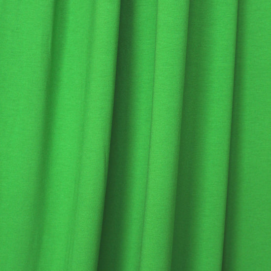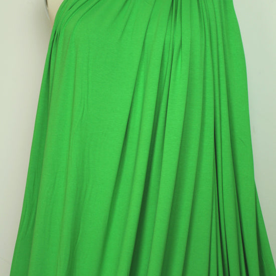 A beautiful 11 oz. rayon/spandex single knit jersey in a kelly green color (16-6340 is close). Rayon/spandex is cool, comfortable, incredibly soft and drapey, and the 11 oz. weight is fabulous for trendy tops and tees, yoga wear, flowy skirt or elastic waist pants, etc. It has about 60% stretch widthwise and lengthwise with great recovery. Machine wash gentle, hang to dry. 1.75 yds.