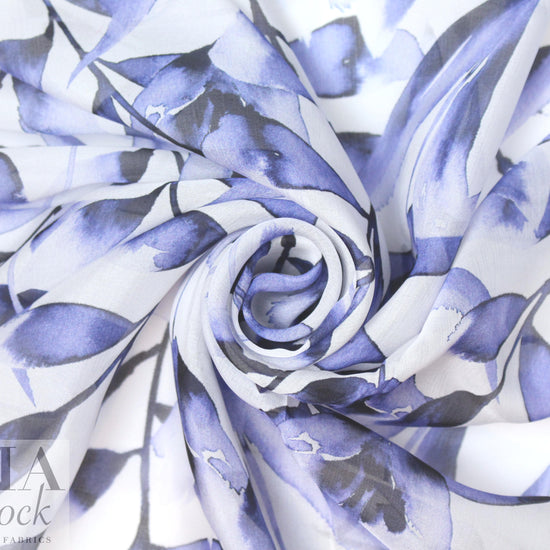 From Italy, this is a wonderful quality printed silk chiffon, a sheer and floaty woven with a romantic tulip floral design (10" repeat) in shades of blue and frosty white (PANTONE 19-3908, 16-3919, etc.). Elegant and feminine, and perfect for a scarf, or line or layer for a blouse, top or tunic. Dry clean, or test first if you wish to hand wash. LAST PIECE, 1 yard.