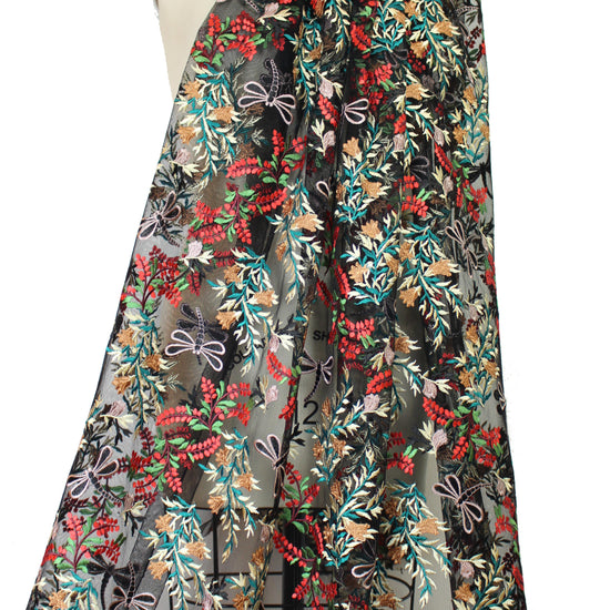 This is an exquisite embroidered mesh, a delicate and summery dragonfly and flower design embroidered on a sheer black mesh ground. The all-over pattern has an 11.5" vertical, 19" horizontal repeat, and it has a flowing, soft drape with a bit of body from all of the embroidery. The glorious colors include shades of red, light gold, spruce, ginger, dusty lilac, leaf, etc. (PANTONE 17-1564, 13-0917, 18-5424, 15-6442, etc.). The mesh does has some horizontal stretch but it is stabilized by the embroidery. Use as an overlay for a gorgeous special occasion blouse, tunic, top, dress, gown, shawl, etc. Hand wash and hang to dry, or dry clean. LAST PIECE, 1.75 yds.