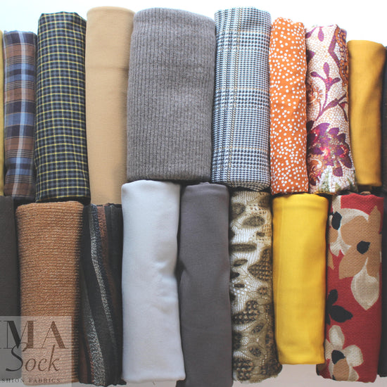 Are you bursting with creativity? Do you enjoy making purses, sachets, pillows, scarves, mittens, hats, doll clothing, color-blocked garments, unconventional quilts or wall hangings, or trimming your garments with a bit of flair? Then these bundles are for you! Sold by the pound, most pieces are 1/4 yard or more, there may be a little flaw here or there, and your cost per yard is WAY below my cost. What a bargain!! This bundle includes knits and wovens in the gold/chocolate family. Not eligible for any additional discount offers. NO RETURNS, AND NO HOLDS.