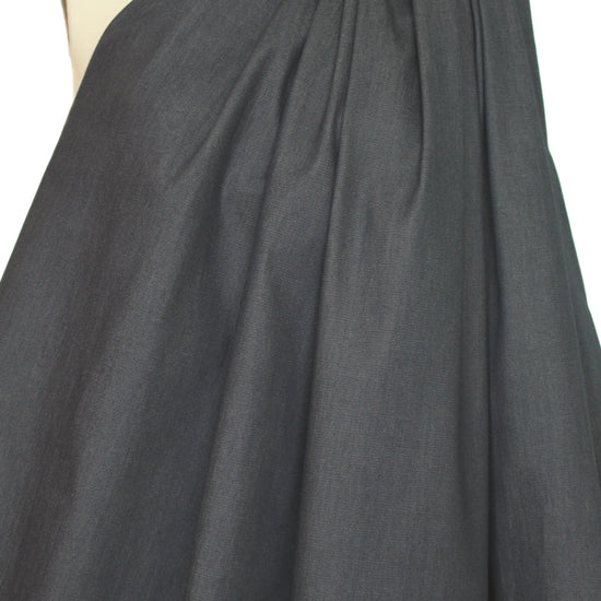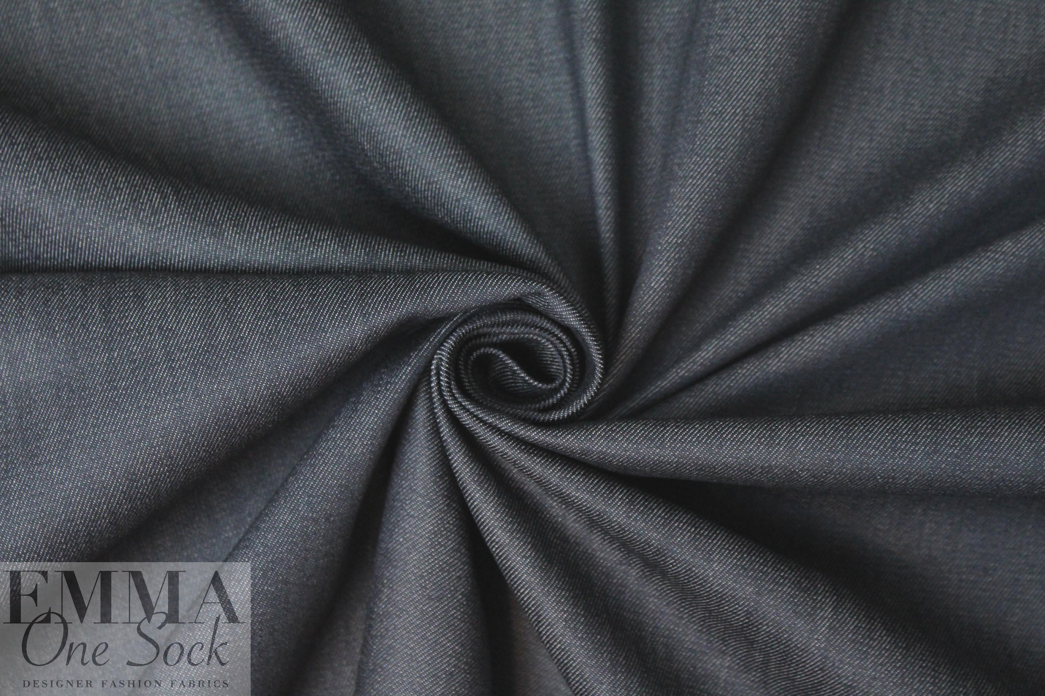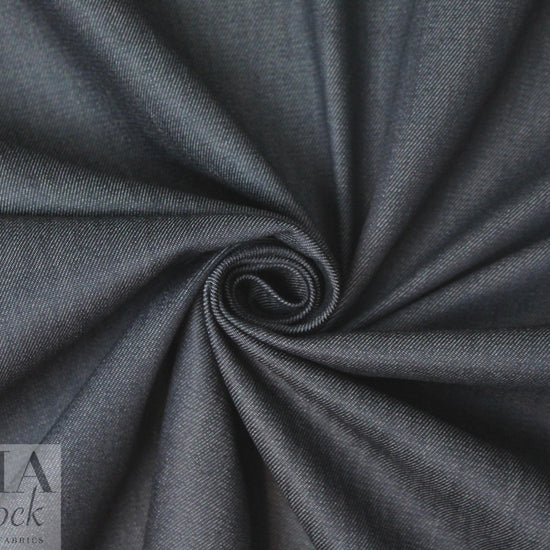 A new stock item! This is a beautiful medium-weight stretch denim twill in an off black that has midnight undertones (PANTONE 19-1102), a fabulous basic that has about 20% stretch in the width only. The addition of recycled polyester makes it a more earth-friendly choice, and the quality and hand of this denim are superb. It is perfect for a jacket, jeans, topper coat, vest, etc. Very malleable, not stiff. Since the crossthreads in this colorway are light, warm gray, the reverse looks quite a bit lighter (PANTONE 16-3801 is the overall, approximate coloring). Machine wash and hang to dry. 1.75 yds.