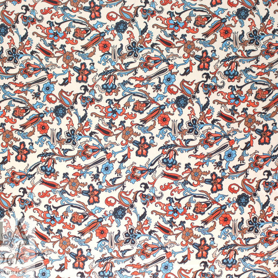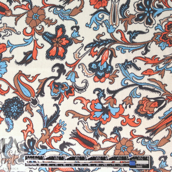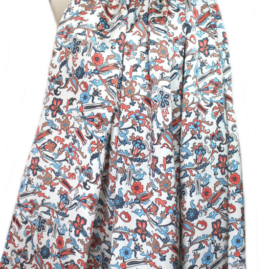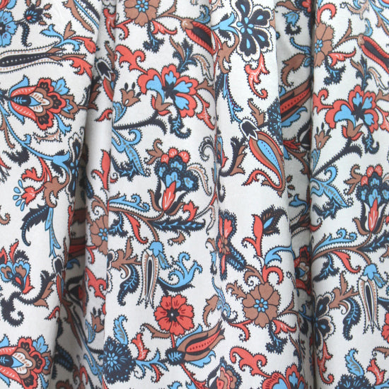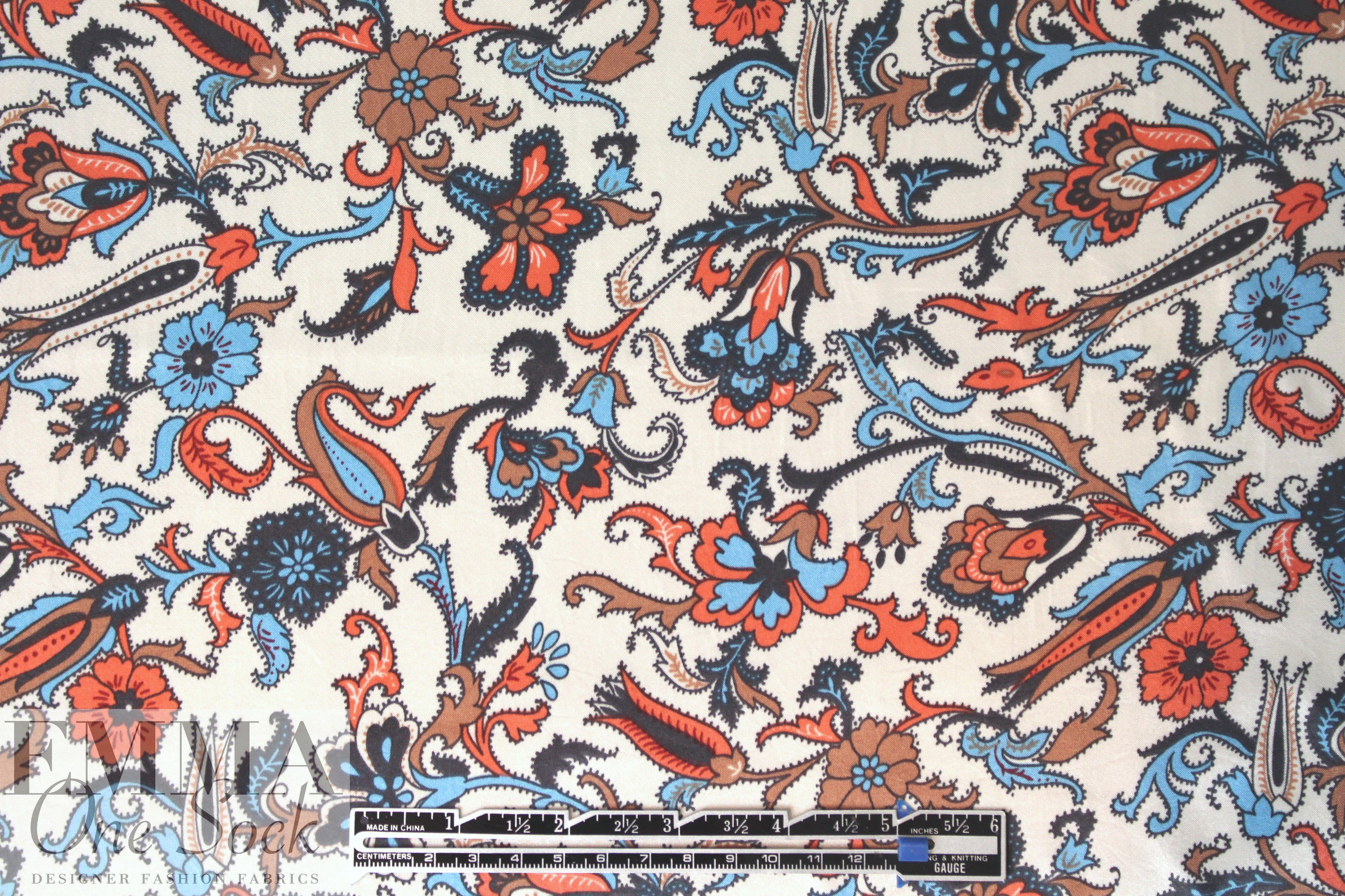 From Derek L@m, this is a new technology polyester woven from Italy that mimics the qualities of silk, and this one is similar to a heavier silk charmeuse or satin. It is opaque and medium weight with an elegant drape that has some body. The decorative paisley floral print (14.5" repeat) features light blue, coral, cafe au lait and midnight on an alabaster ground (PANTONE 13-4411, 14-1323, 16-1220, ). Perfect for a structured dress or skirt, kimono, tunic, jacket or topper coat, etc. Dry clean, or test first if you would like to hand wash and hang to dry. 1.75 yds.