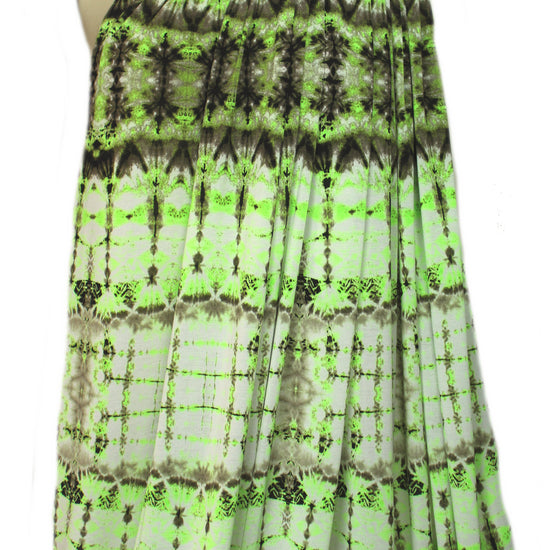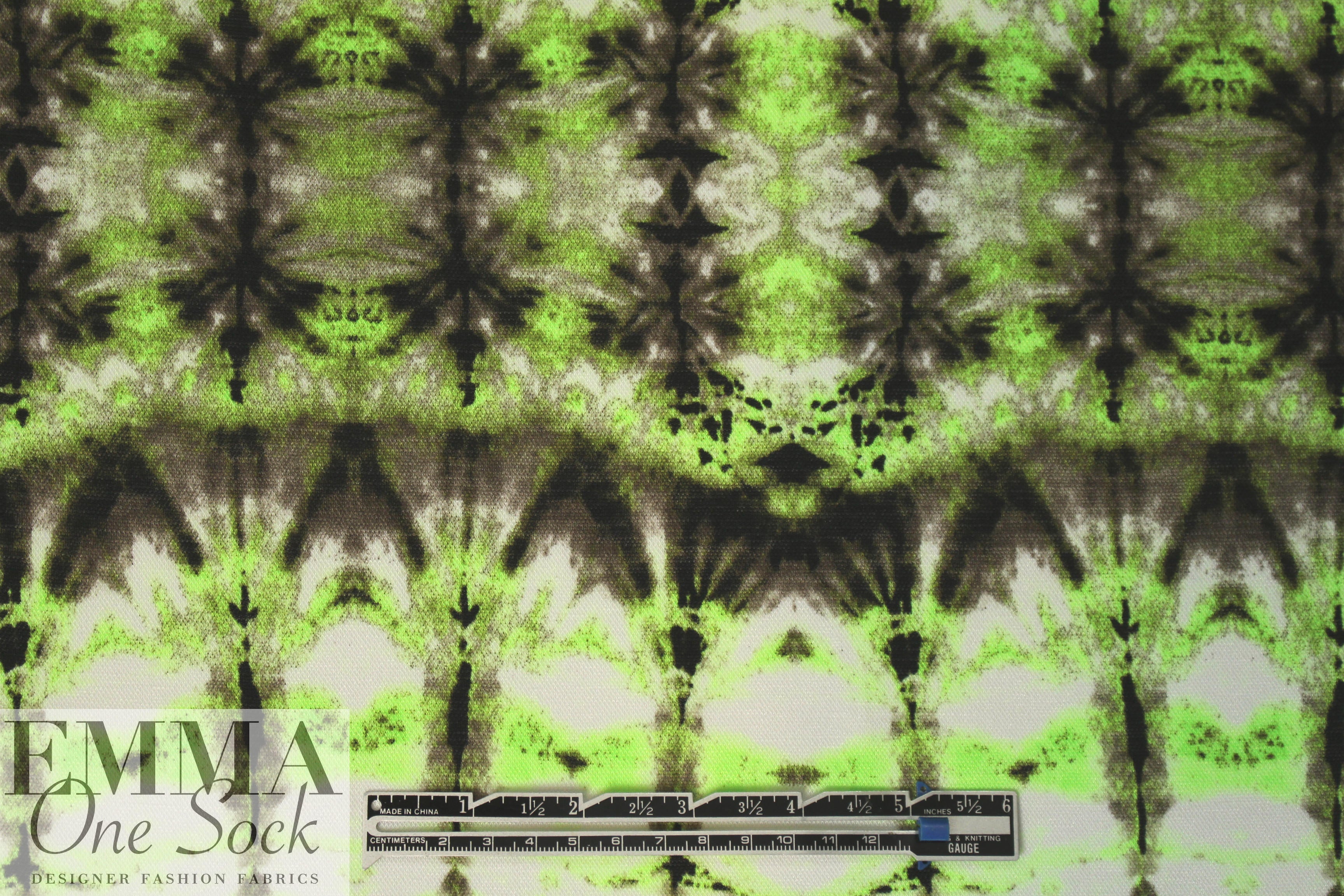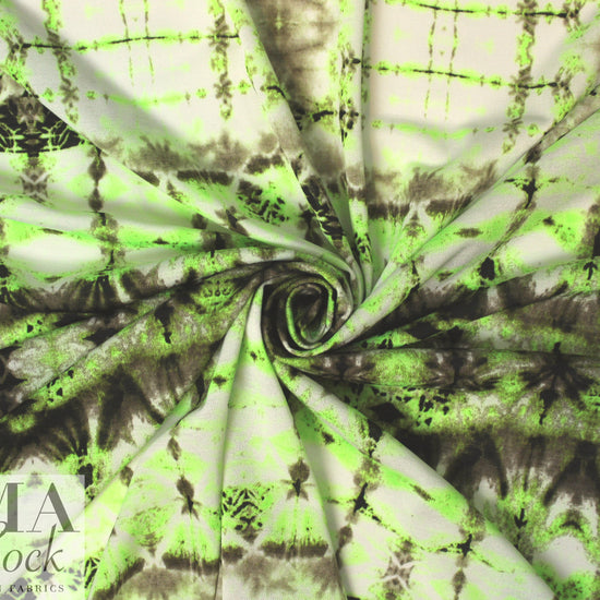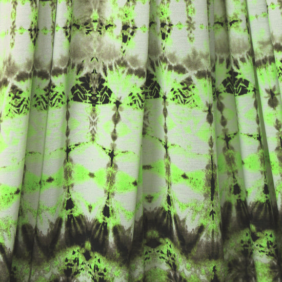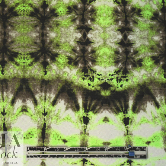 This is a fabulous poly/spandex knit with 130% in the width only, a featherweight knit with a fine mesh texture. It is semi-opaque with a soft drape, and the fabulous neon tie dye print (28" repeat) features neon-ish lime green, espresso, mocha and white (PANTONE 14-0244, 19-0508, etc.). It is perfect for easy care tops, tees, tunics, beachwear, etc. Some styles may need lining (power mesh or shaper power net mesh), self-lining, or layering. Please test first: Machine wash, hang to dry. 2 yds.