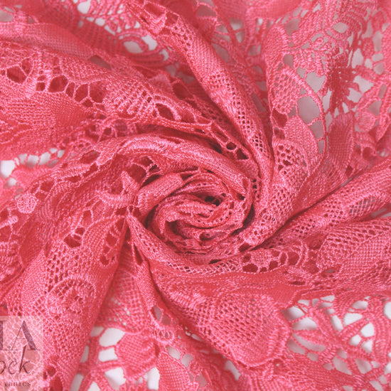 From Monique Lhui11er, this beautiful French guipure lace is so elegant and classic, and the color is gorgeous candy pink (PANTONE 16-1723). The floral motif goes all the way out to the edges to create lovely shaped selvages. It has lots of texture and dimension. It has a soft drape, no stretch, and it is perfect for any project calling for guipure lace: tops, tunics, dresses, skirts, jackets, etc. Some styles will need lining or layering. Dry cleaning recommended. 1.5 yds.