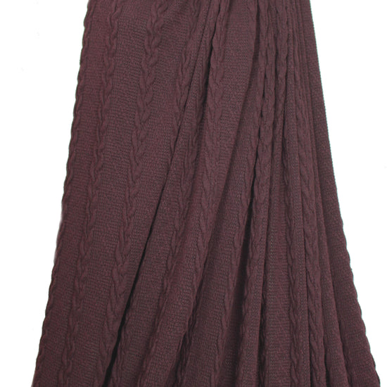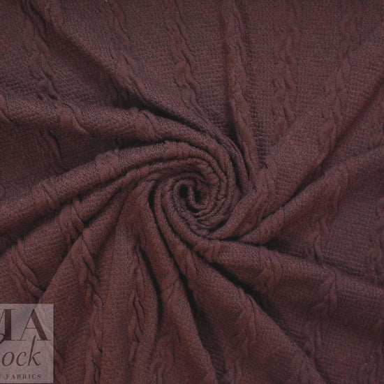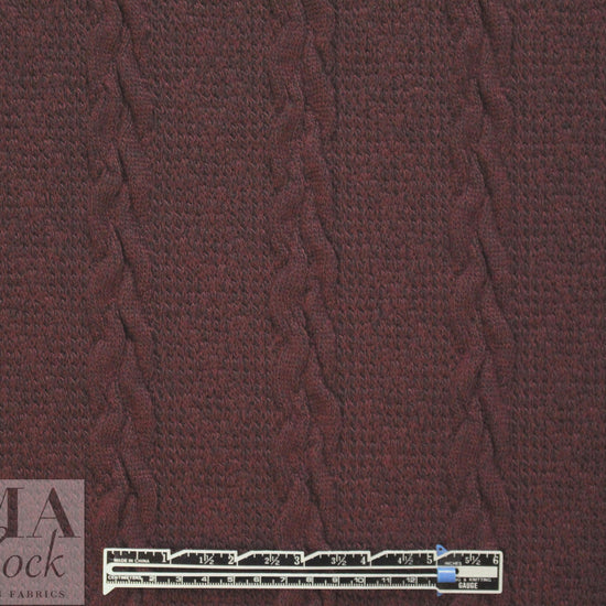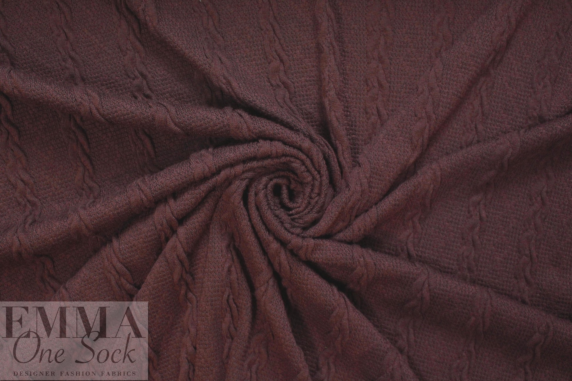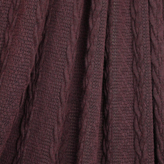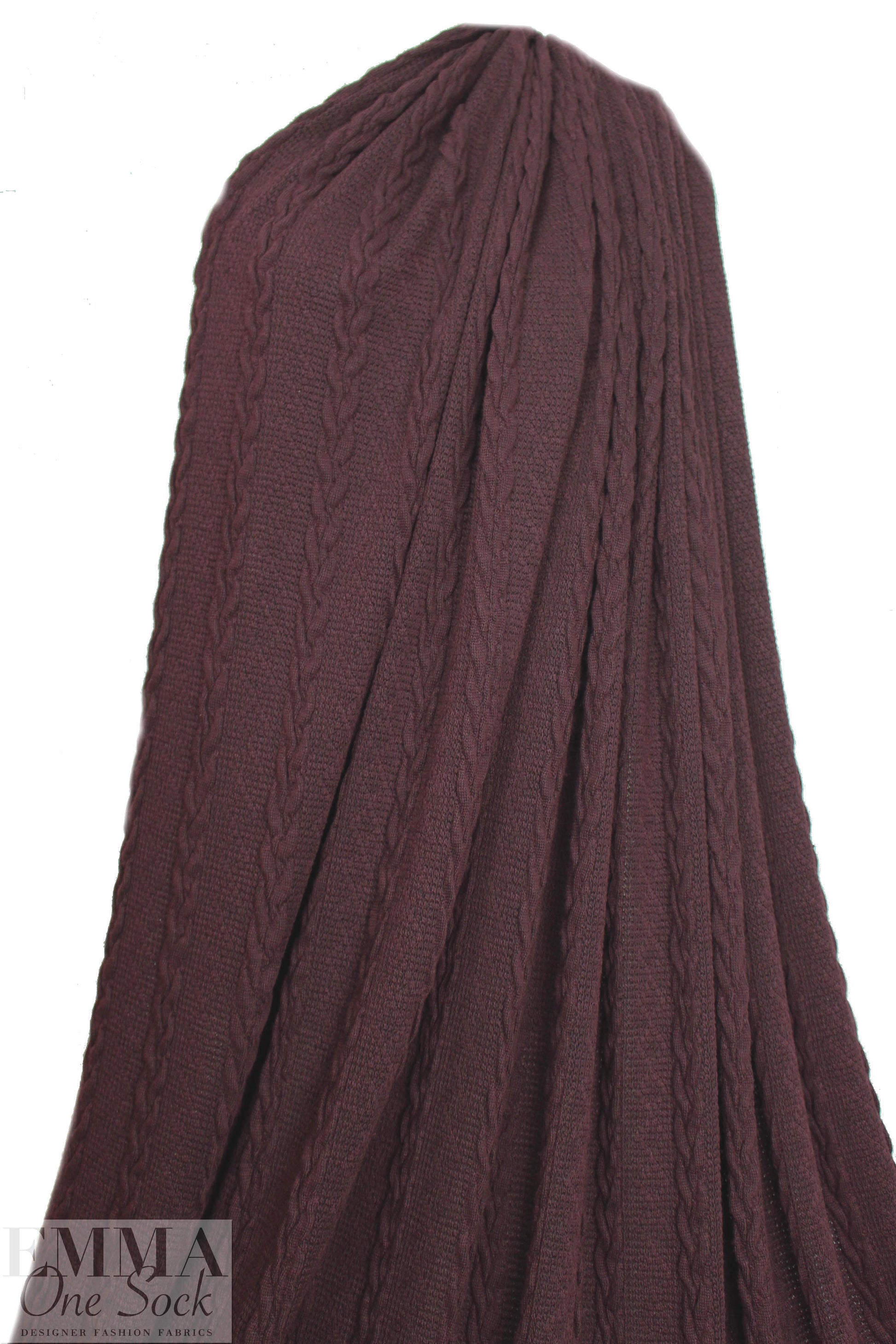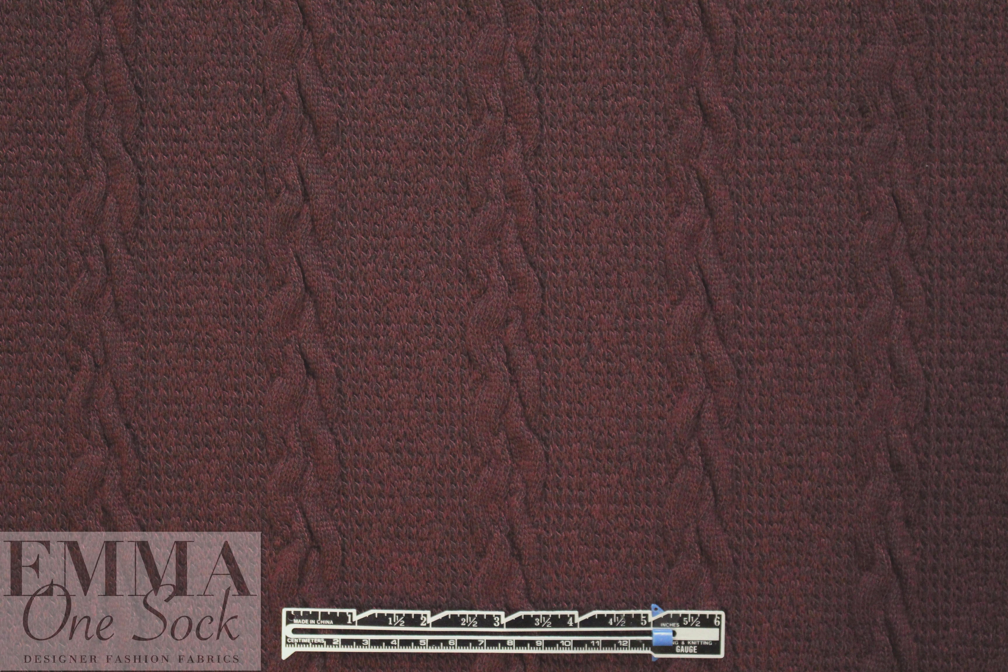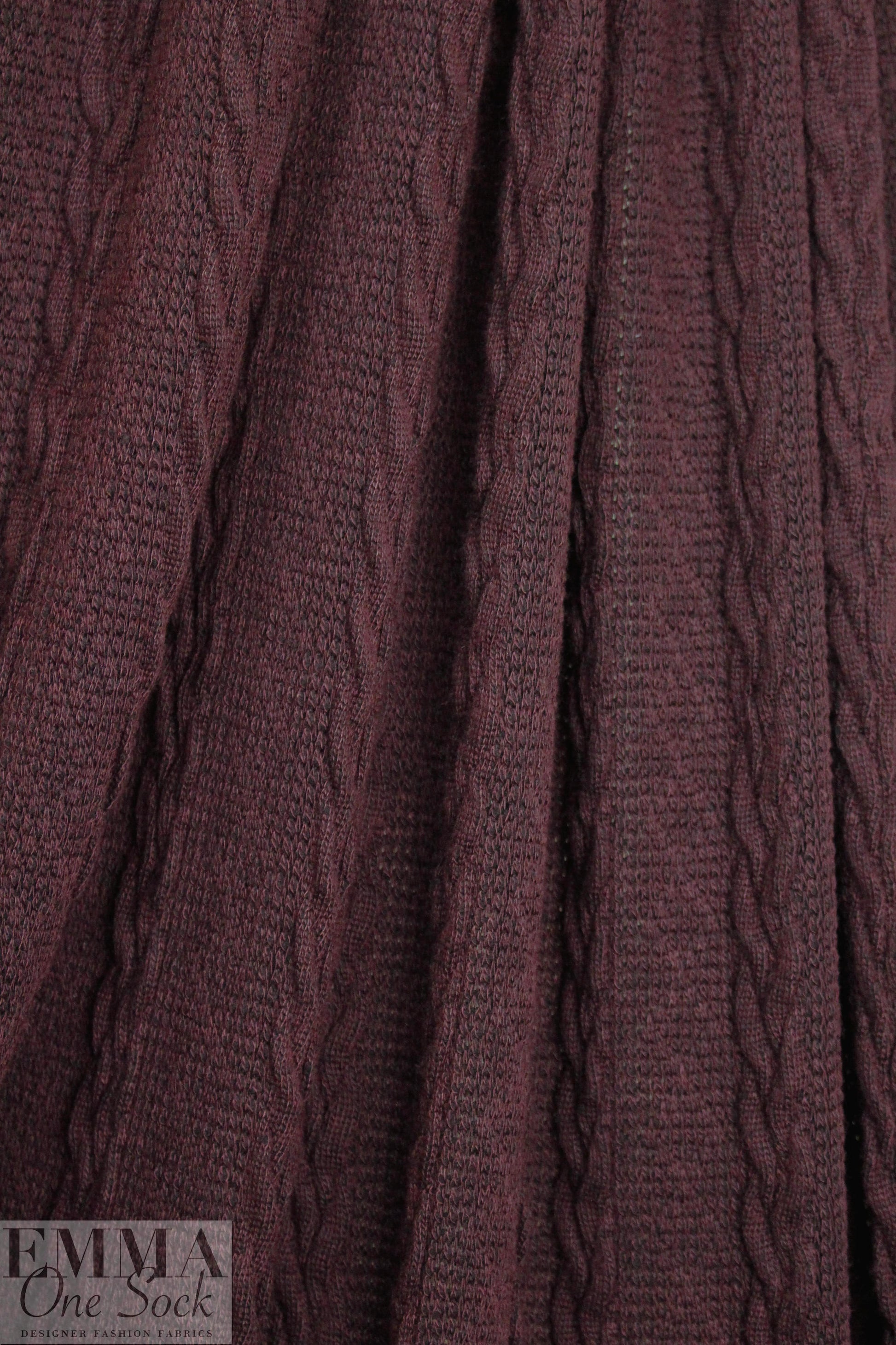 This cable sweater knit is classic, beautiful and easy care! The color is a gorgeous merlot with some lighter and darker very fine yarns knitted through to give it a slightly tweedy look (PANTONE 19-1623). It is a medium-light weight sweater knit with a soft drape, and lots of dimension and texture. With about 80% widthwise stretch, it has great springback due to rows of black elastic yarns woven through the back of the knit. The cables run lengthwise and the horizontal repeat is 2.875". This beauty is perfect for cardigans, pullovers, a tunic, scarf, etc. The knit is very slightly open in some areas so some styles may need lining or layering. Machine wash in cool water, gentle cycle, lay flat to dry (please test first).
