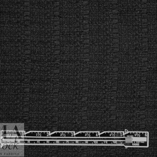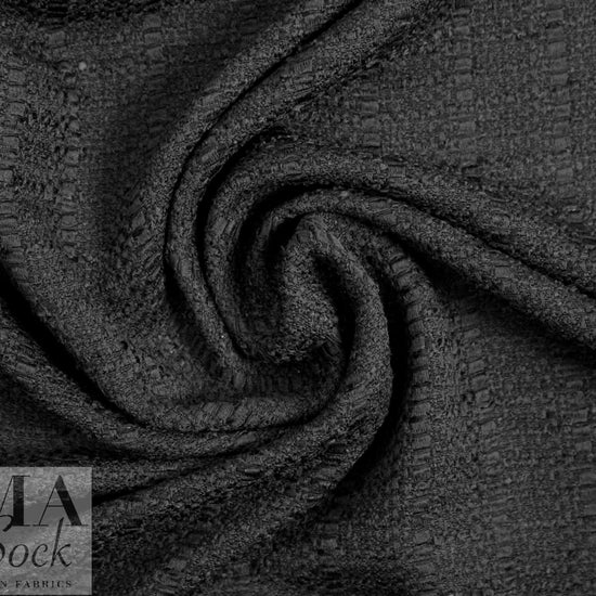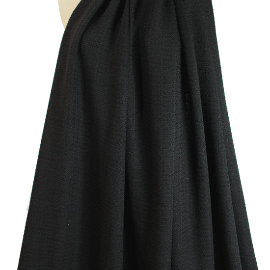 A beautiful viscose blend boucle' suiting from a NY designer, a lovely medium-light weight woven with a variety of yarn textures and roughly a 7/8" repeat. It is opaque with a soft drape, and the color is jet black. It is perfect for a jacket, suit, skirt, sheath dress, etc. Classic and clean, very sophisticated. Dry cleaning recommended.