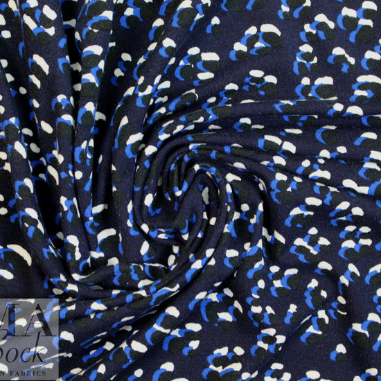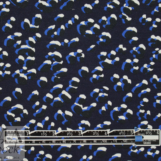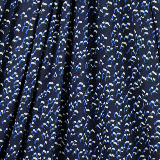 From France, this is a fabulous viscose/elastic 4-way stretch knit, lightweight yet opaque, with lovely drape and a very soft hand. The print is a versatile, small scale confetti motif in midnight-black, cobalt and soft white (PANTONE 19-4053, 19-4010). 35% stretch in the width, 20% in the length, with great recovery. Great for tees, tops, tunics, etc. Test first if you would like to hand or machine wash, and hang to dry.