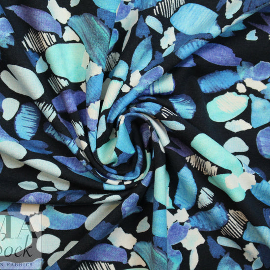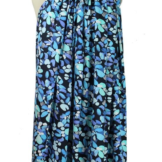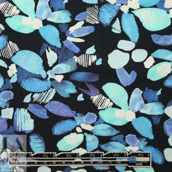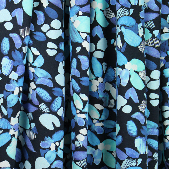 Here's another AMAZING cotton/lycra panel print imported from The Netherlands! First, the quality of the fabric is sublime, soft and substantial, with about 60% stretch in both directions. It is opaque and has a soft hand and drape with body. It is Oeko-Tex certified for non-toxic chemicals and dyes. This wonderful "petal power" print (8.75" repeat) had a lovely abstracted floral design in shades of blue and white on a midnight blue-black background (PANTONE 19-3920, 15-4427, 17-4139, 14-4816, etc.). Make a great tee, top, tunic, etc. The manufacturer recommends hand or machine wash warm, hang to dry. Please test first.