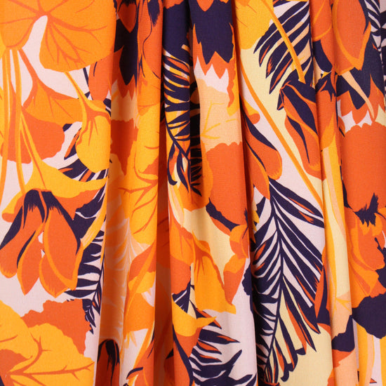 Made in Italy, this is a gorgeous Dries Van N0tten-inspired floral, printed on a wonderful quality viscose crepe woven. The spiced tulip silhouette design (30.5" repeat) features very current shades of orange, peachy-cream, midnight-grape and dusty pink blush (PANTONE 16-1343, 19-3722, 13-1031, 12-2903). (This fabric was produced for the upcoming season, so it's a bit more expensive.) It is light weight and nearly opaque with a soft drape, a slight surface texture, and it is a perfect choice for blouse, top, tunic, dress, skirt, etc. A dress or skirt may need lining. Test first if you wish to hand wash and hang or lay flat to dry, or dry clean.