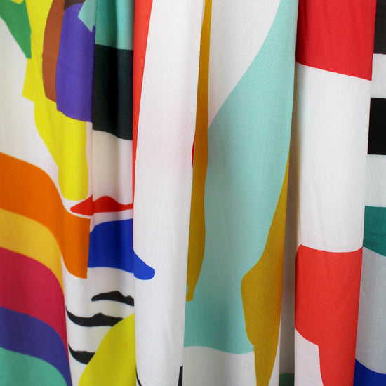 From the designer, Massim0 Dutti, and made in Italy, this is a stunning viscose woven, lightweight yet nearly opaque, drapey, soft and smooth. The wonderful "Matisse's garden" print (30.5" repeat) features shades of red, blues, yellow, greens, peach, soft aubergine, etc. (PANTONE 19-3950, 12-0917, 18-3211, 14-0755, 17-1755, 16-6127, etc.). It is perfect for a pretty blouse, top, tunic, dress or skirt, etc. Dry clean or test first if you wish to try hand washing, and hang to dry.
