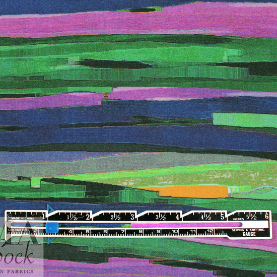 This is a beautiful Italian viscose crepe, lightweight and semi-opaque with a soft and flowing drape. The "vivid painterly stripes" design (59" repeat - yes, that is accurate) features black, royal blue, citrus, petal pink, lime, etc. (PANTONE 19-3950, 18-6018, 14-0951, 16-3617, 18-3224, etc.). Make a tunic, blouse, shirt, top, dress, etc. Some styles may need lining. Please test first if you wish to hand wash, and hang to dry, or dry clean.