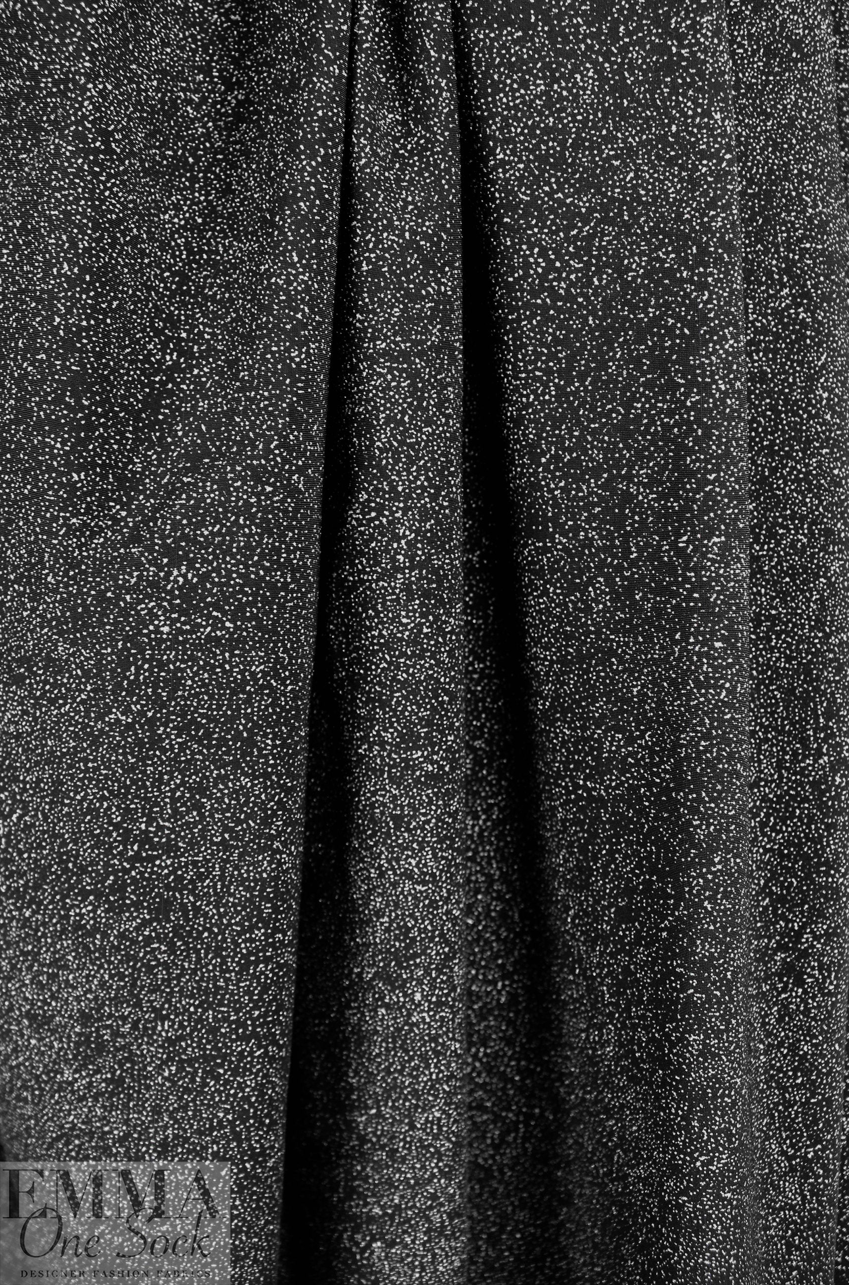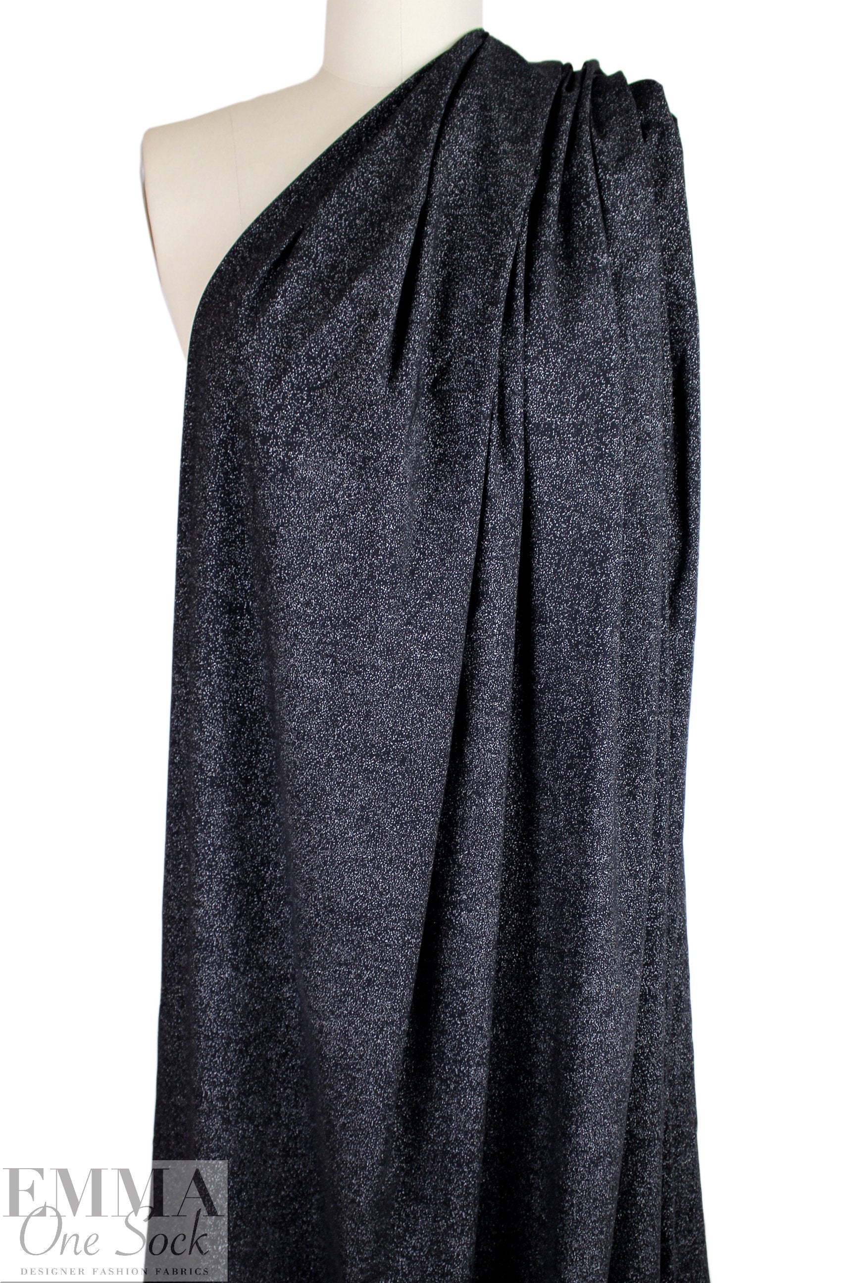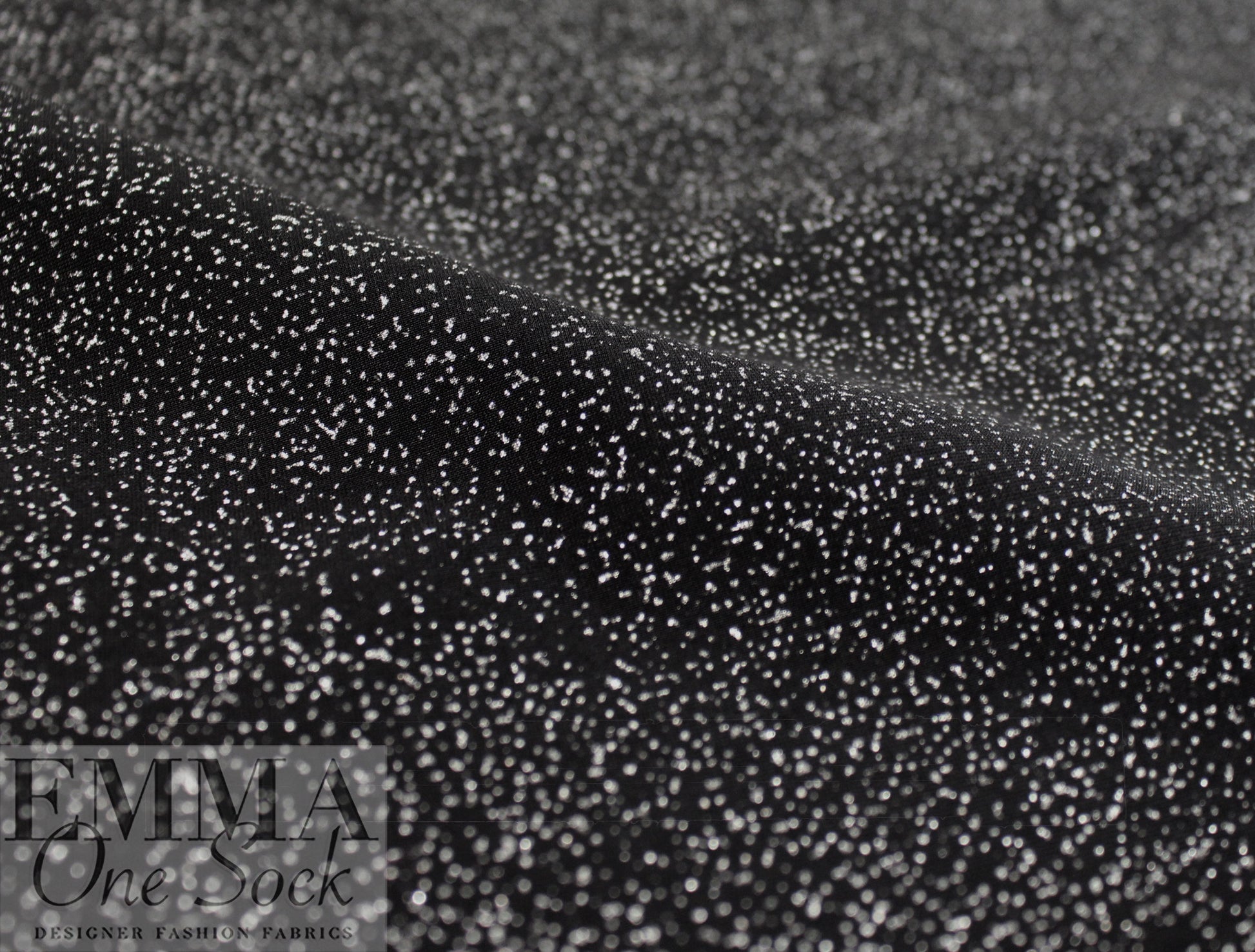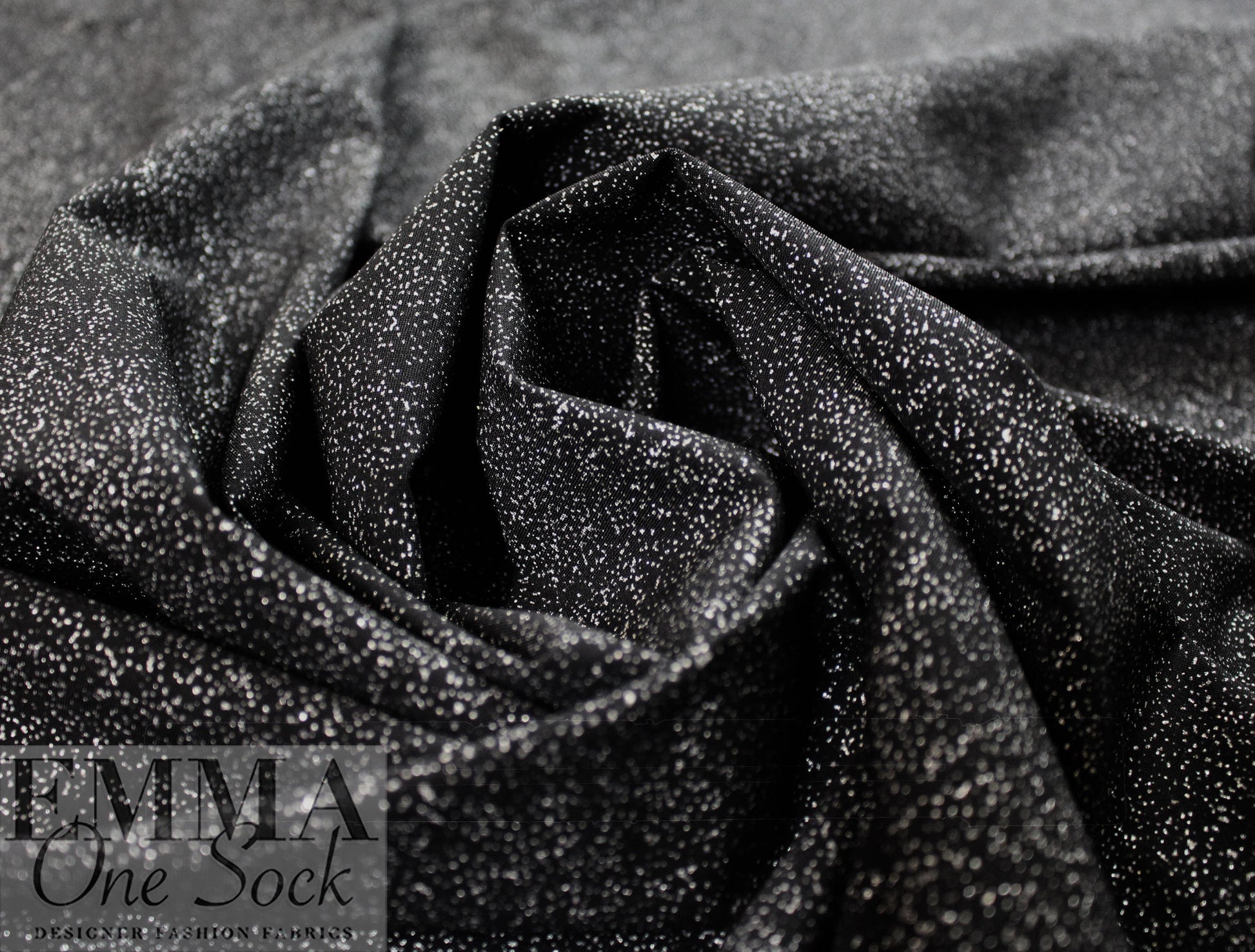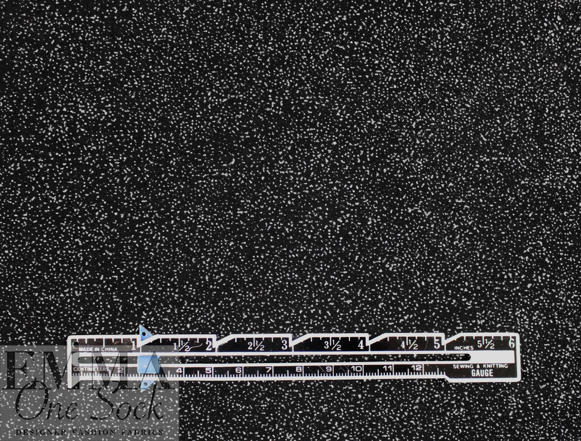 This is a fabulous poly/lycra knit with about 50% stretch in the width, 15% in the length, with great recovery. It is lightweight and opaque a soft drape. The 'salty sparkle' print is a mix of teeny matte gray and sparkly white dots on a jet black background. It is perfect for easy care tops, tees, tunics, swimwear, active wear, etc. Machine wash, hang to dry or tumble dry low (please test first).