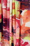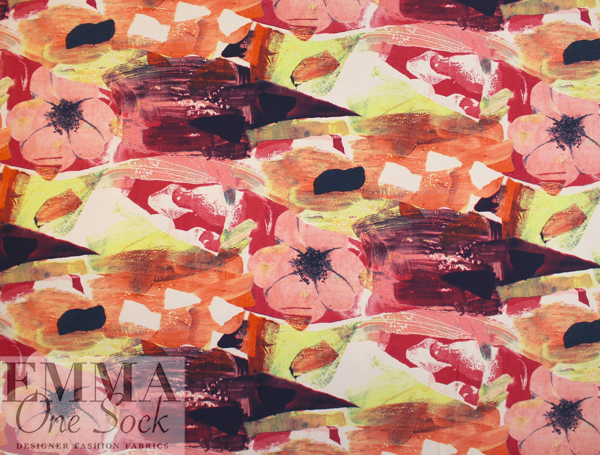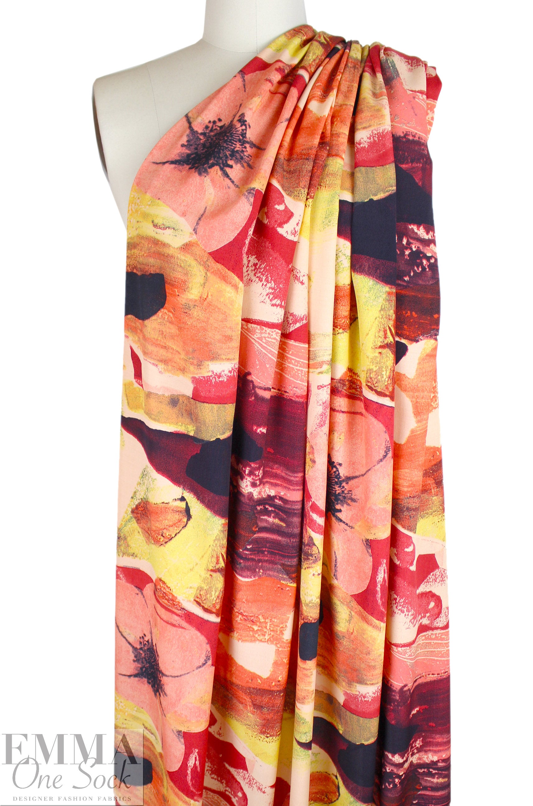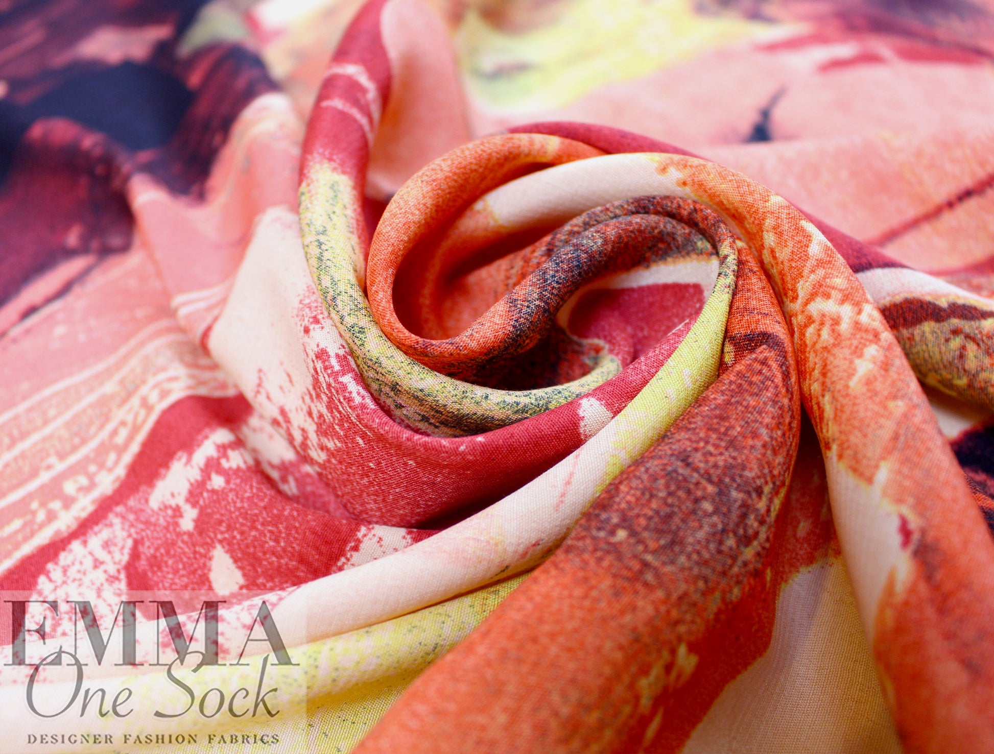This is a stunning Italian viscose crepe, lightweight and opaque with a soft and flowing drape. The "painted brushstroke floral" design (24.5" repeat) features mixed shades of coral, deep red, tinted black, orange, soft yellow, grassy green, etc. (PANTONE 15-1433, 17-1740, 13-0932, 19-1629...ish, etc.). Make a tunic, blouse, shirt, top, dress, gown, etc. Some styles may need lining. Please test first if you wish to hand wash, and hang to dry, or dry clean.