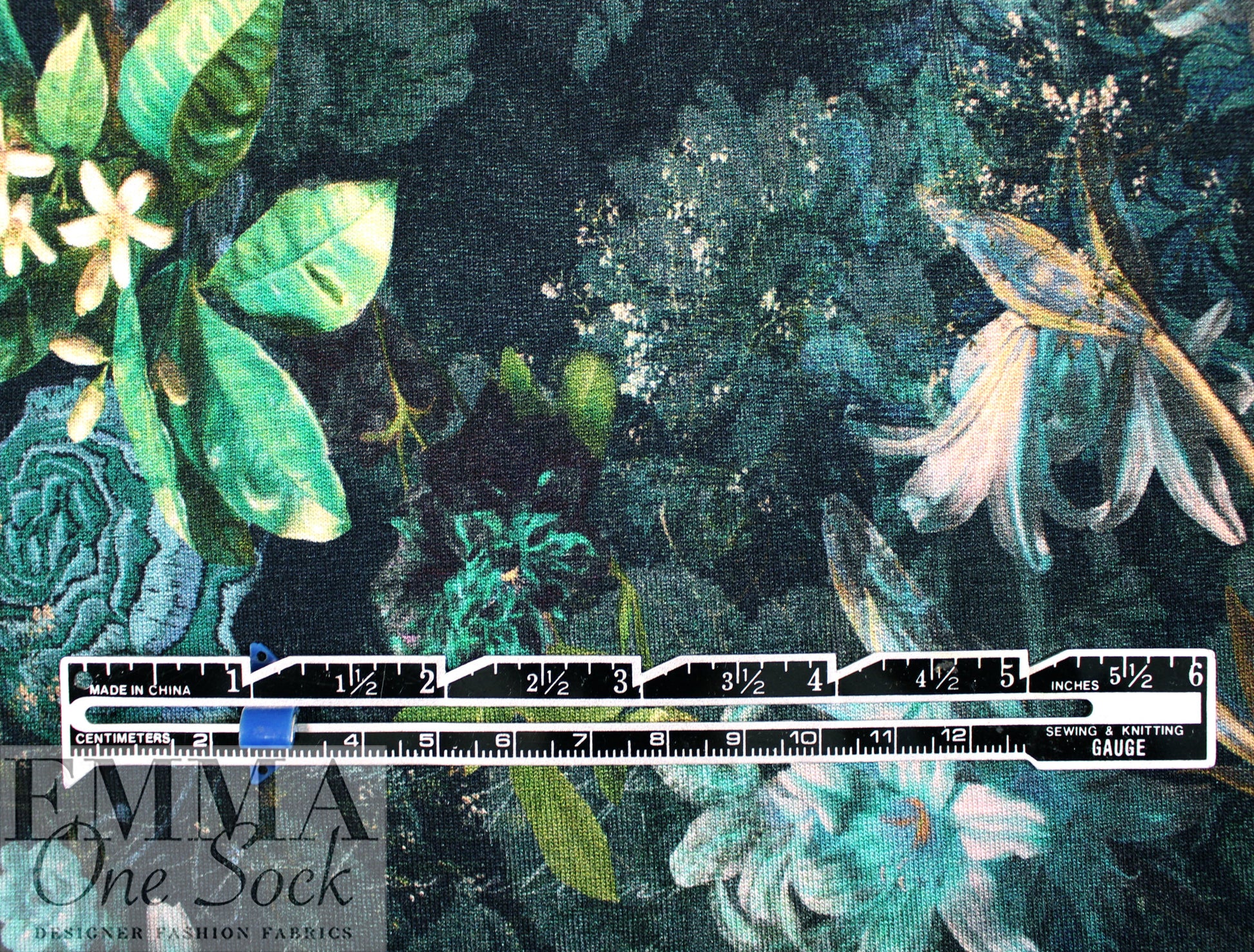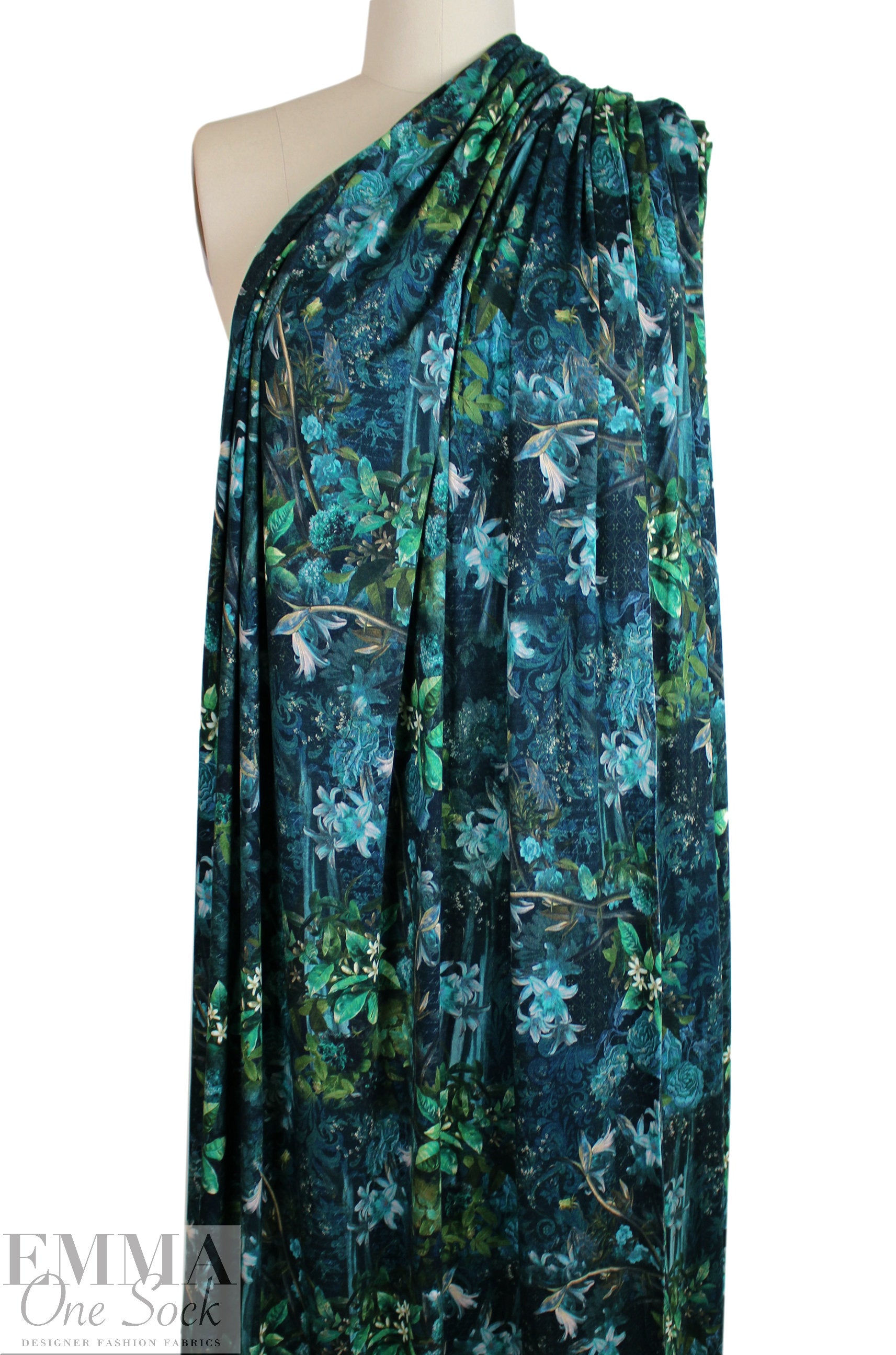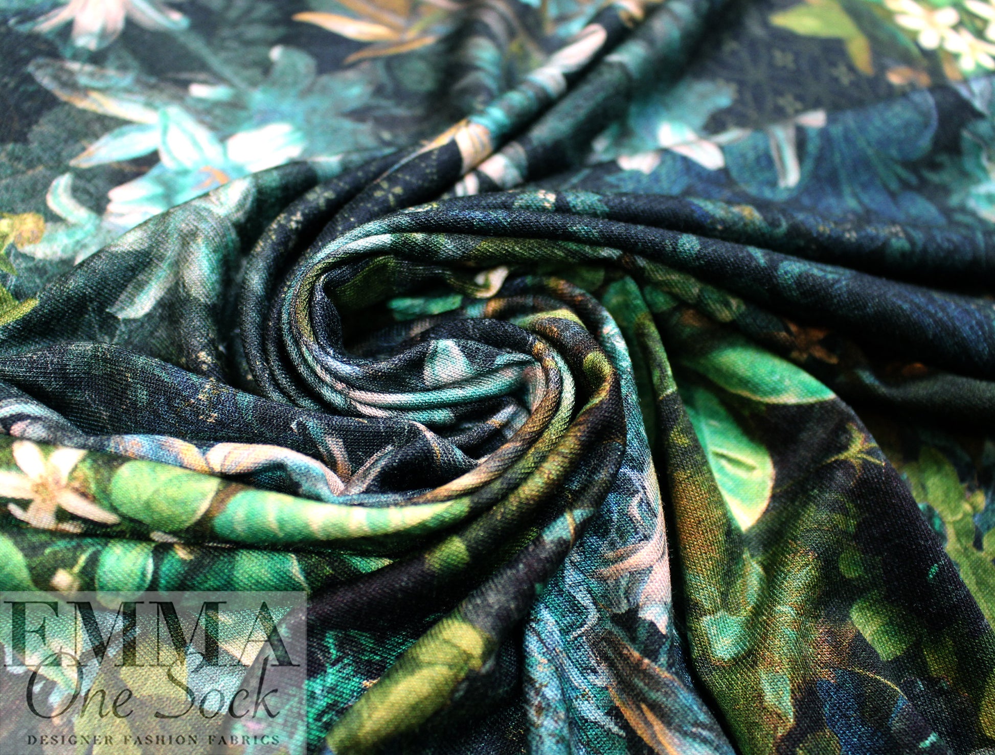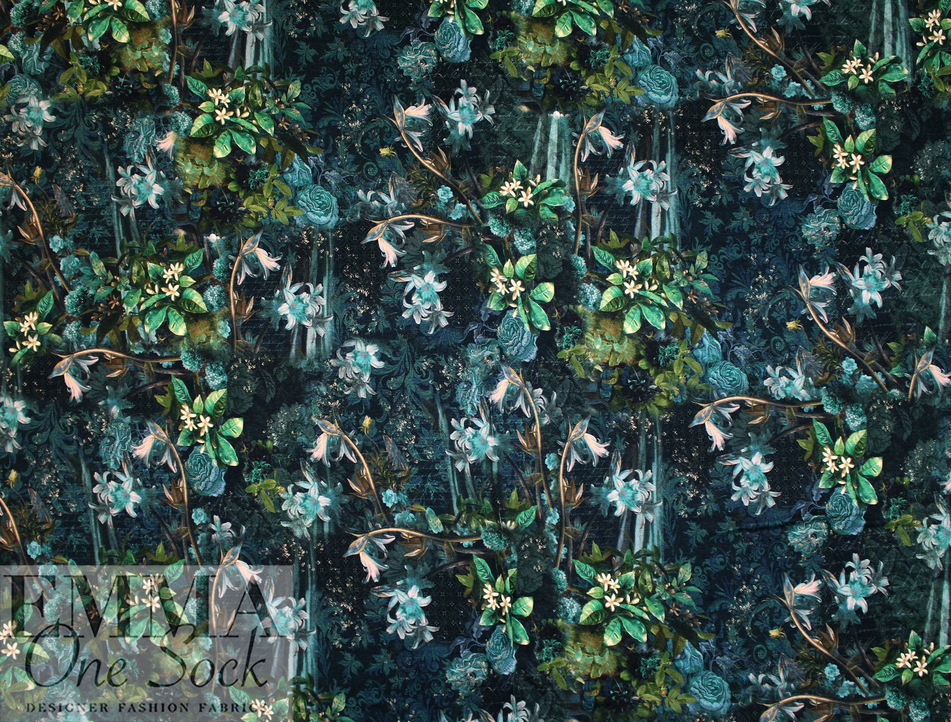 Here's a VISCOSE/lycra print imported from The Netherlands! First, the quality of the fabric is sublime, soft and drapey, with about 50% stretch in both directions. It is opaque and has a buttery hand and drape. The digital print is equally sublime, a "night garden" print (12.5" repeat) featuring shades of teal, green, alabaster, khaki, etc. (PANTONE 19-4318, 17-4735, 18-0627, 18-5621, etc.). It is Oeko-Tex certified for non-toxic chemicals and dyes. Make a very special tee, top, tunic, skirt, dress, etc. The manufacturer recommends hand or machine wash warm, hang to dry. Please test first.