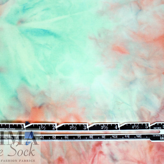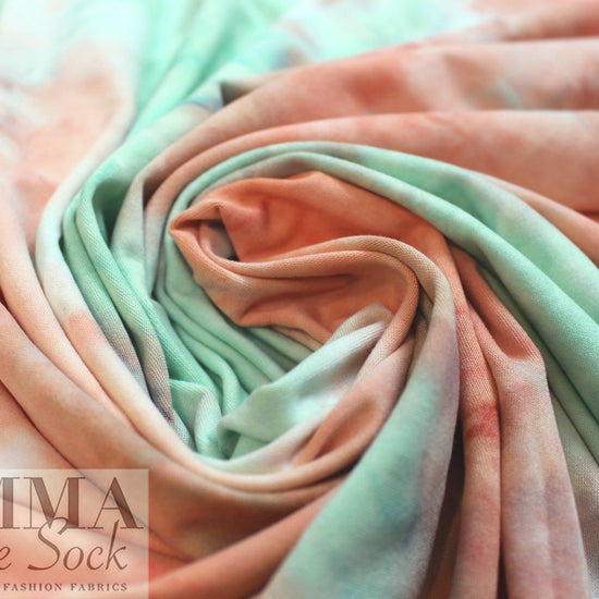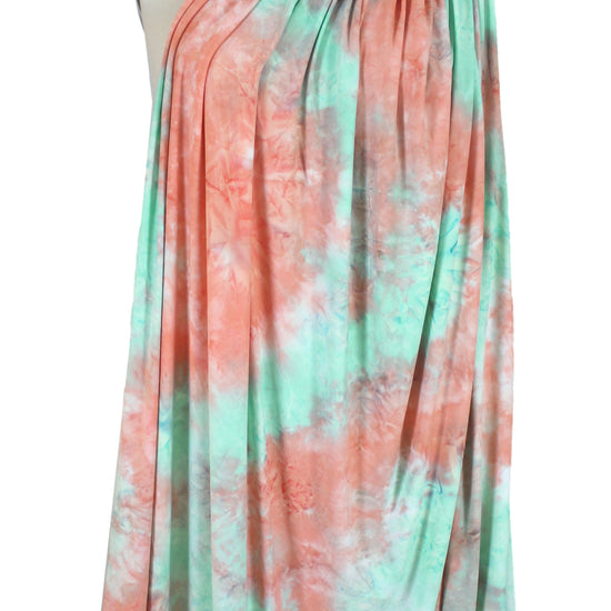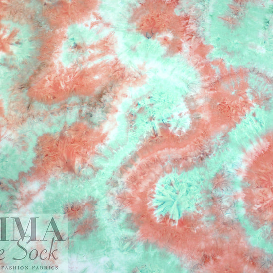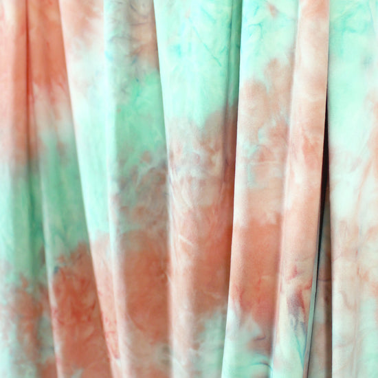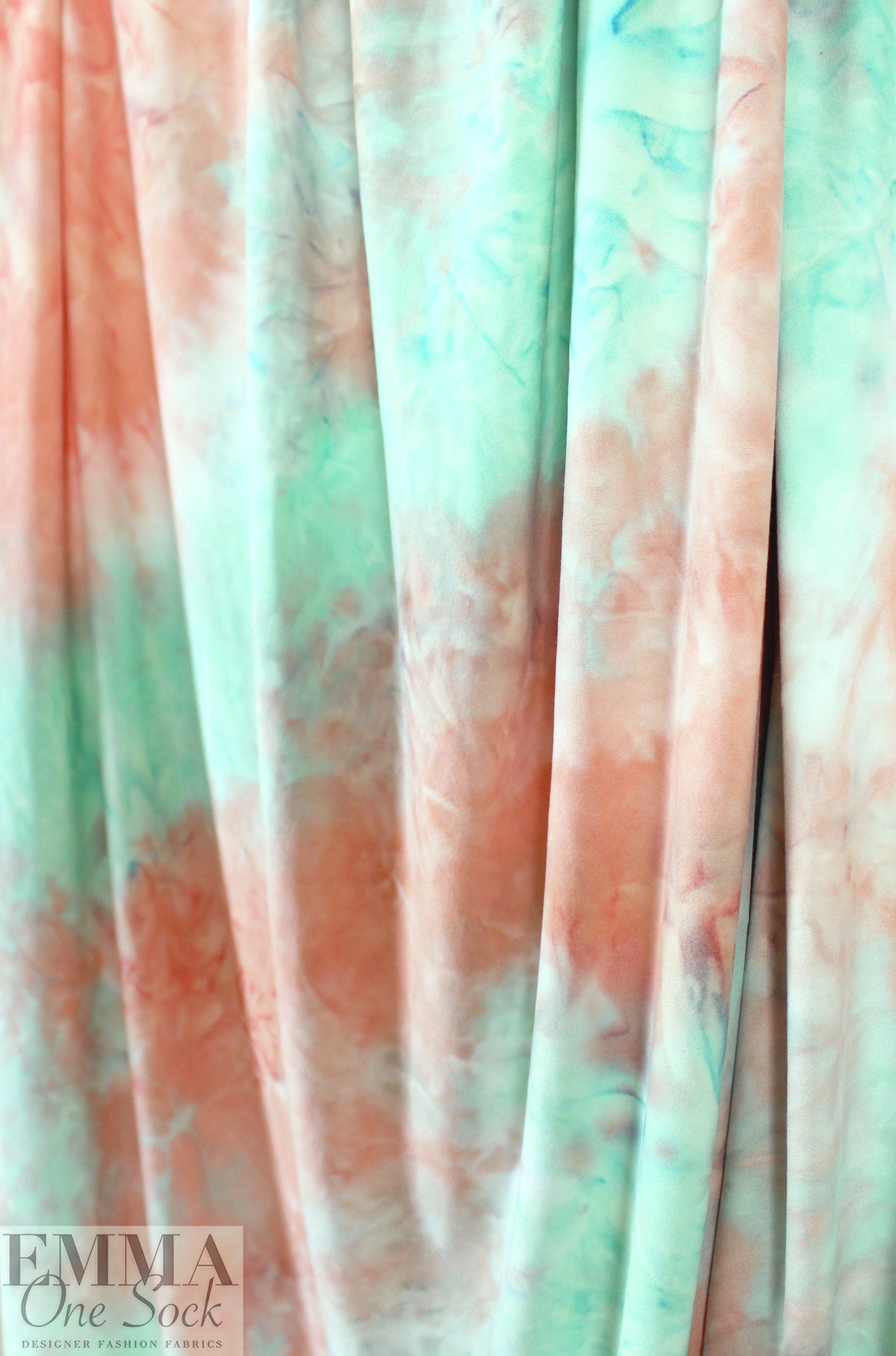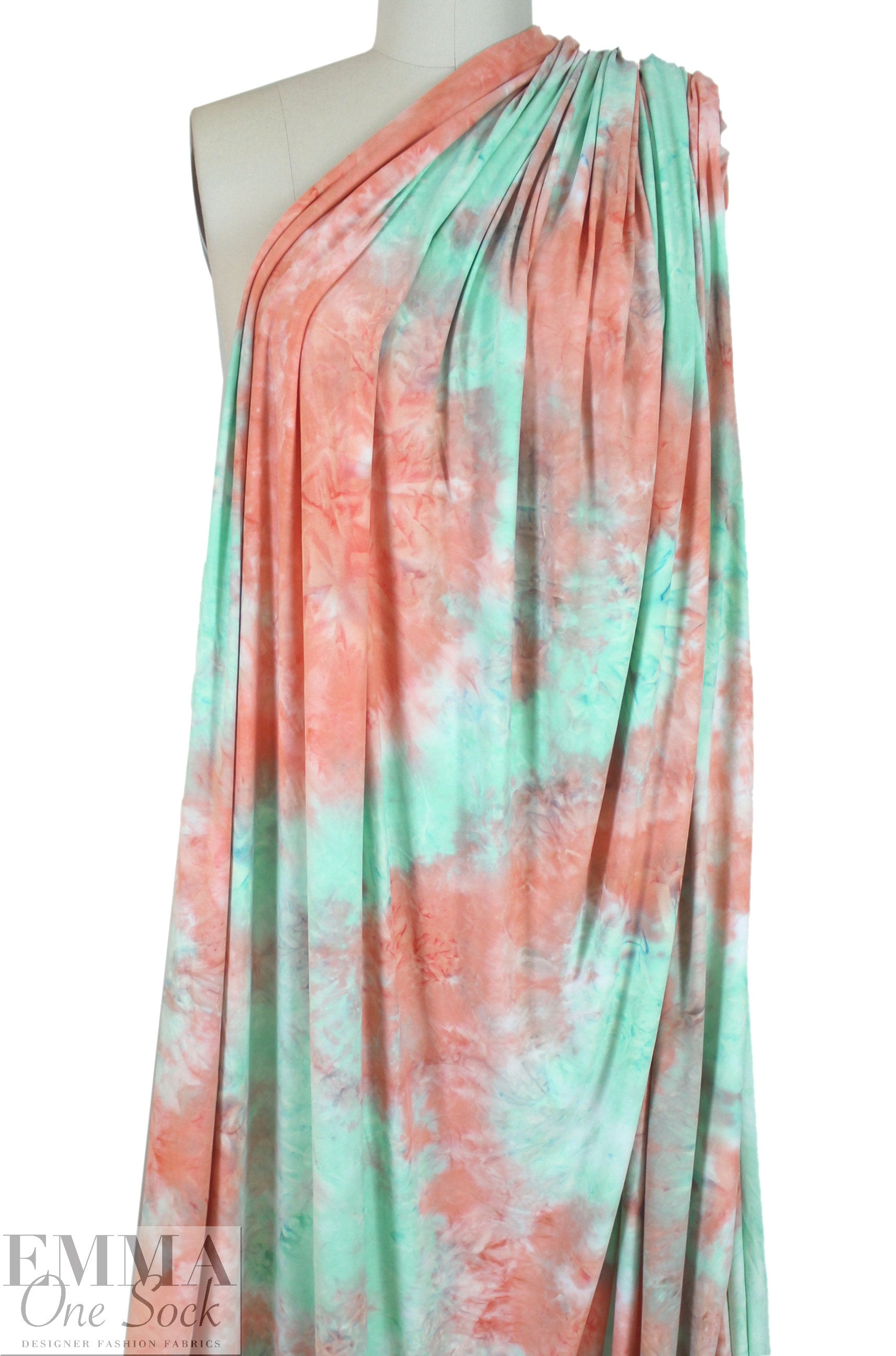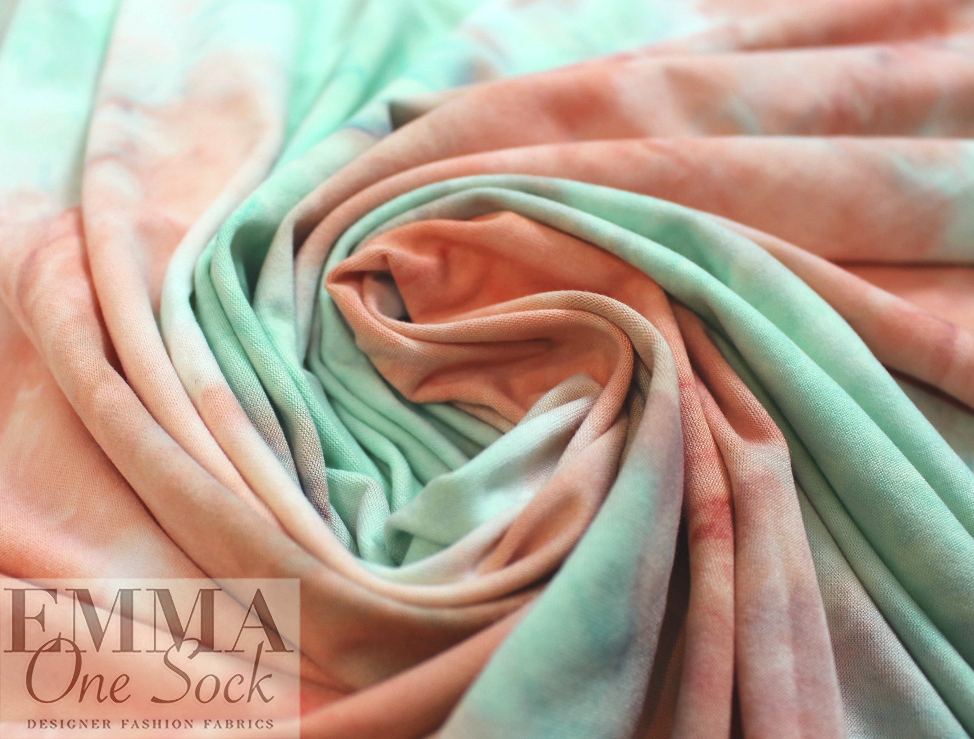 From a NY designer, this easy care knit is lightweight and drapey, with about 60% widthwise stretch. It is opaque and has a buttery soft hand. The tie dye print is a classic, and has a gorgeous palette of coral and jace on a soft white ground (PANTONE 16-1529, 15-5218, etc.). Make a great tee, top, tunic, etc. Hand or machine wash warm, hang or tumble to dry. Please test first.