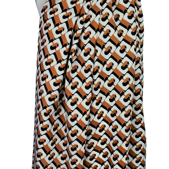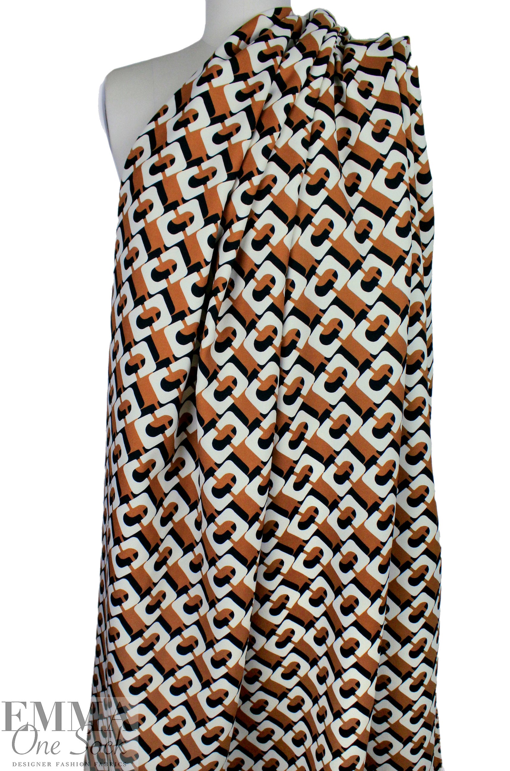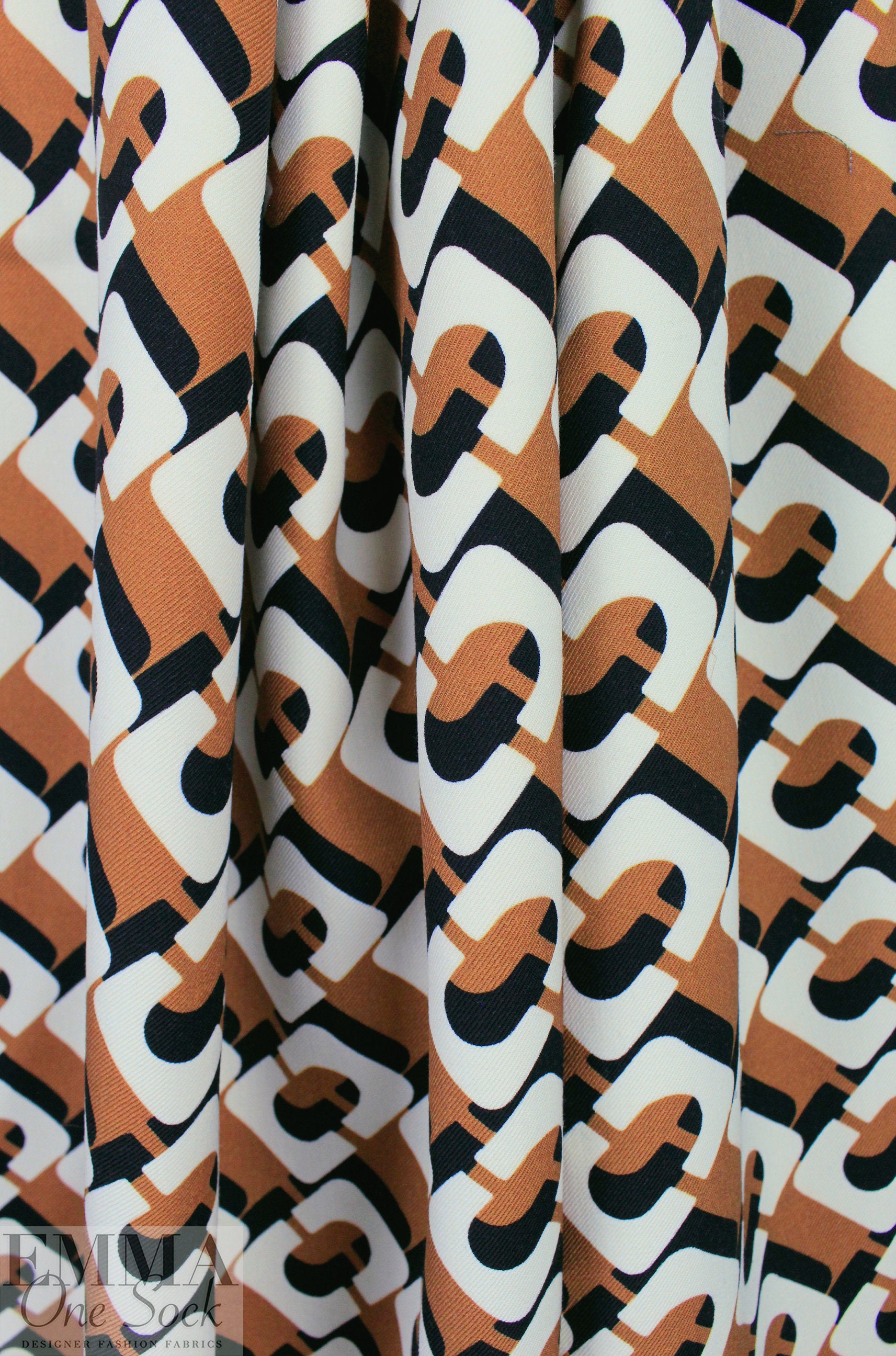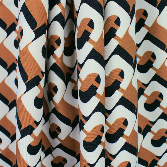 Just in from Italy, and made for the famous design house, this is an exquisite quality printed wool and silk twill weave, medium-weight and opaque with some body in the drape. It has a very soft hand, and the handsome and classic graphic design (2.25" repeat) features caramel, black and ivory (PANTONE 18-0950). It is a fabulous choice for a jacket, topper coat, suit, tailored skirt or fitted dress, winter slacks, etc. Dry cleaning recommended.