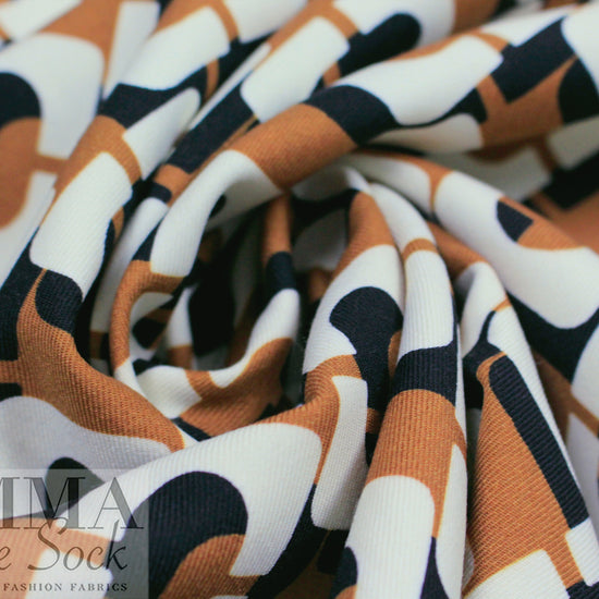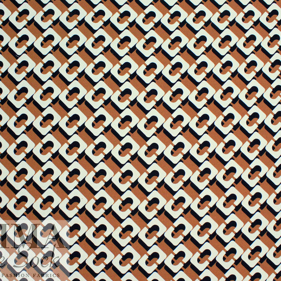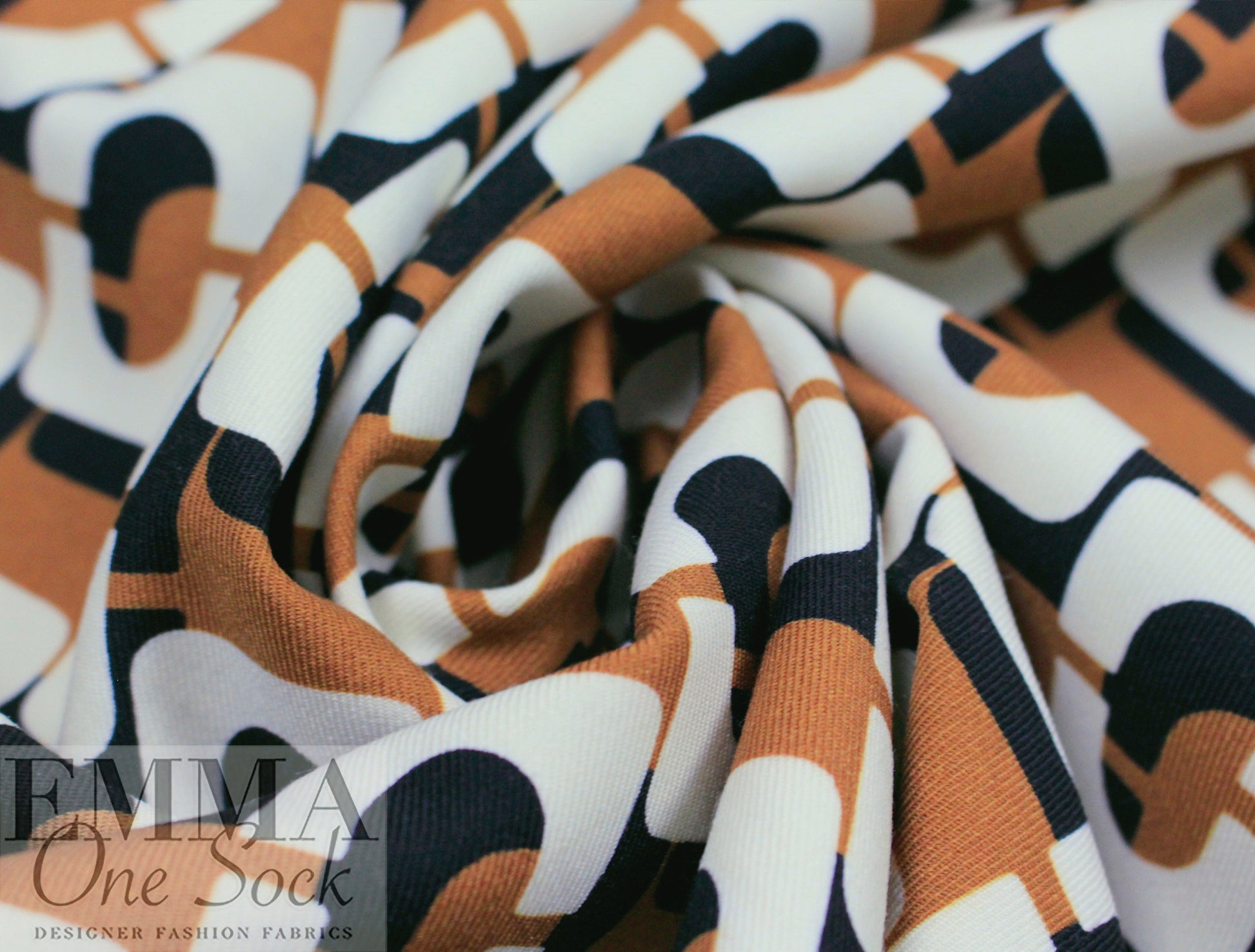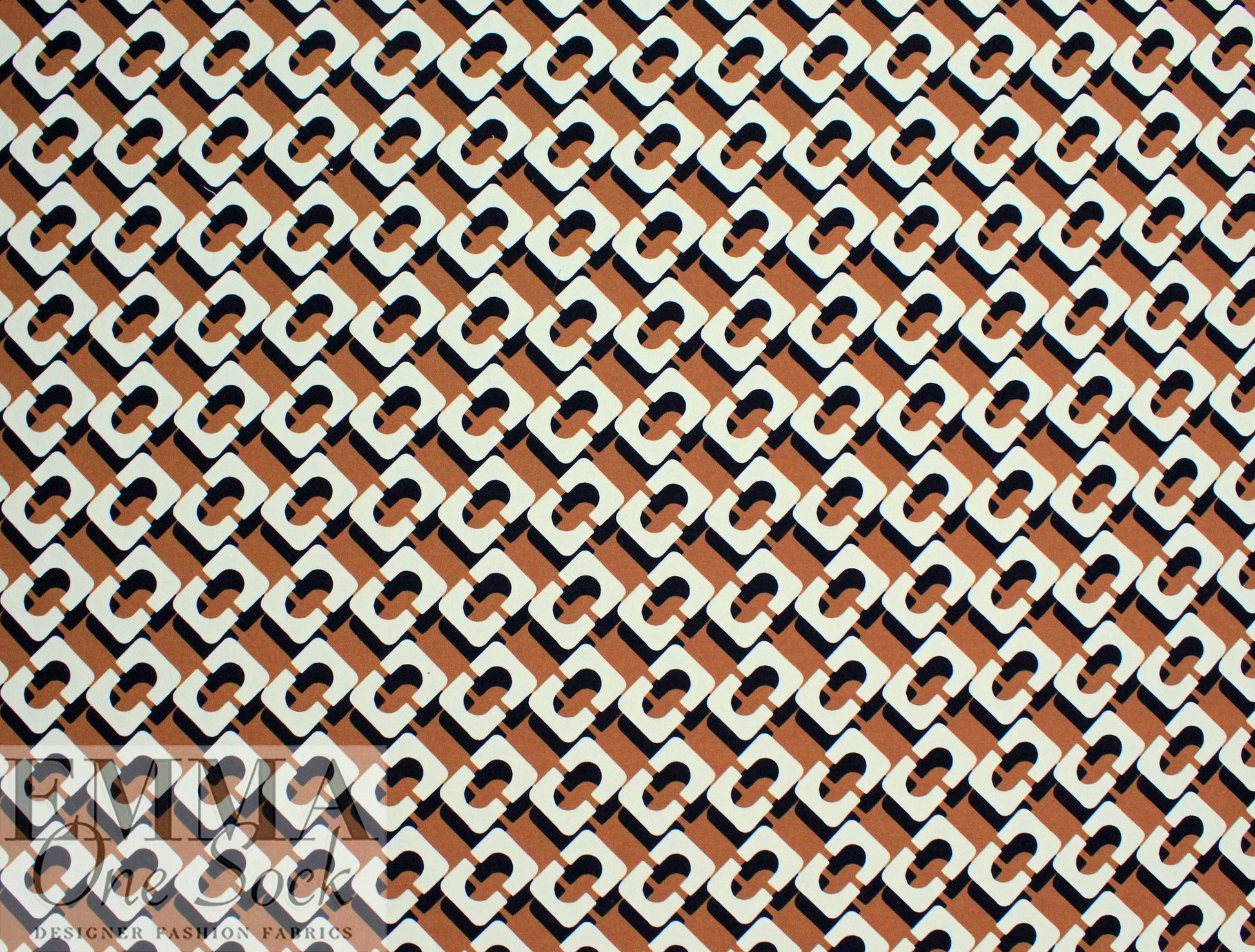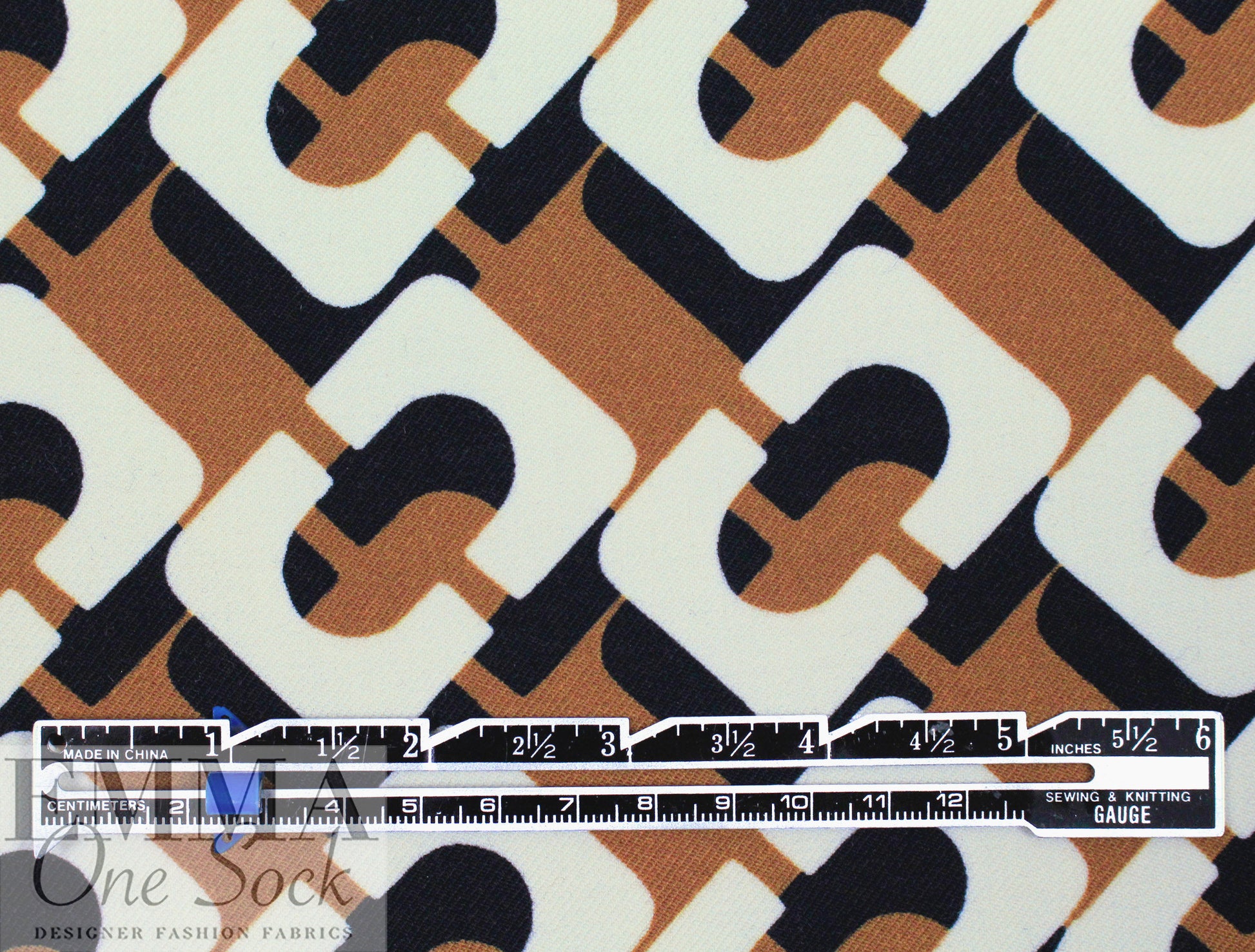 Just in from Italy, and made for the famous design house, this is an exquisite quality printed wool and silk twill weave, medium-weight and opaque with some body in the drape. It has a very soft hand, and the handsome and classic graphic design (2.25" repeat) features caramel, black and ivory (PANTONE 18-0950). It is a fabulous choice for a jacket, topper coat, suit, tailored skirt or fitted dress, winter slacks, etc. Dry cleaning recommended.
