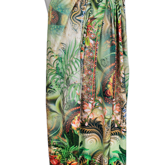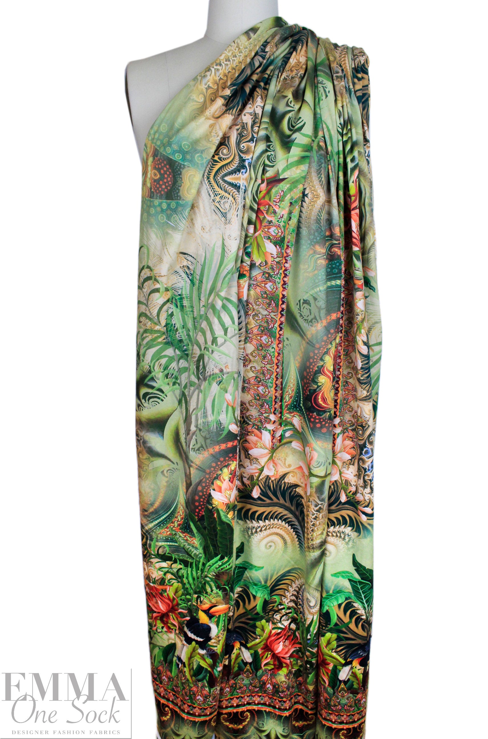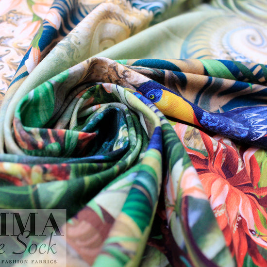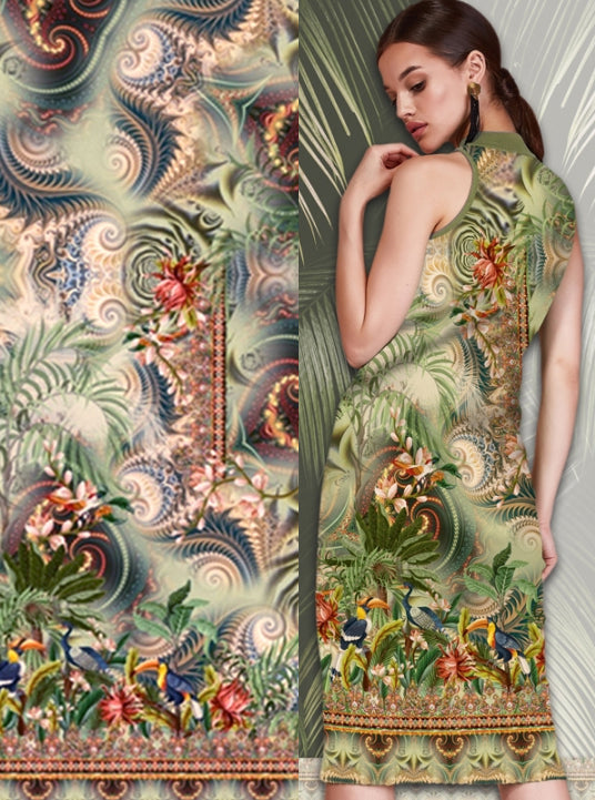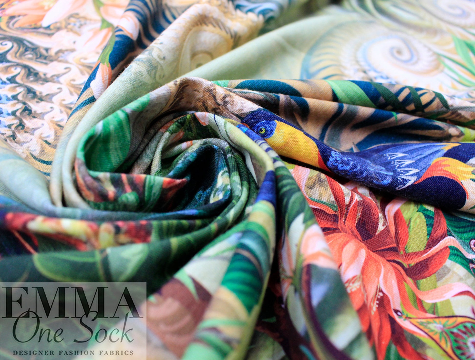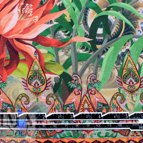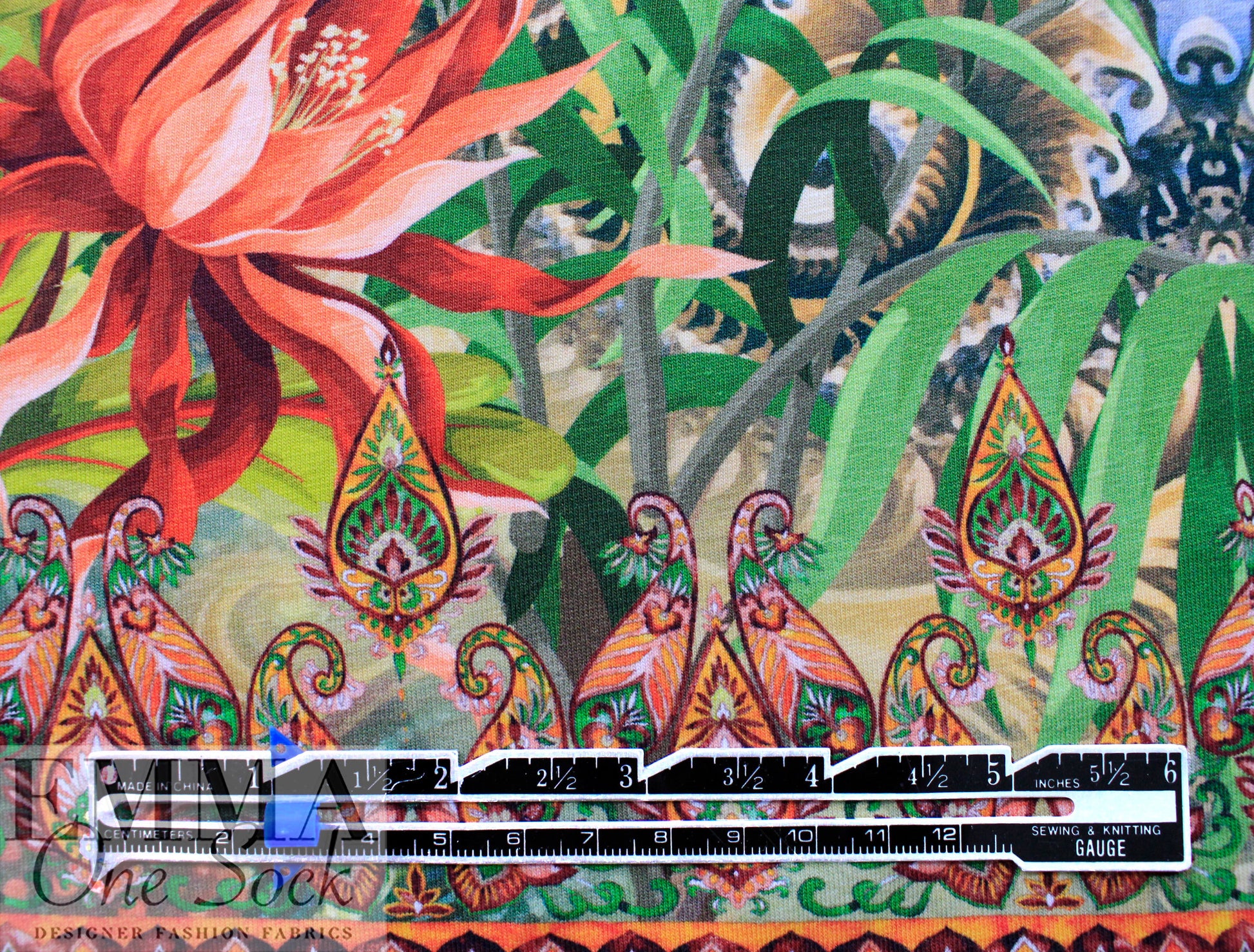 Here's another AMAZING cotton/spandex panel print imported from The Netherlands! First, the quality of the fabric is sublime, soft and substantial, with about 60% stretch in both directions. It is opaque and has a soft hand and drape with body. It is Oeko-Tex certified for non-toxic chemicals and dyes. The absolutely stunning digital panel print called "tropical fractals" features greens, reds and earthtones (PANTONE 12-0418, 12-0812, 17-0230, 16-1338, 18-1663, 17-1350, 19-4014, etc.). One photo below shows the entire panel. Make a very special tee, top, tunic, skirt, dress, etc. Strategic placement of your pattern pieces can result in many unique garments, and remember that you can lay your garment in either direction because the stretch is about the same. The manufacturer recommends hand or machine wash warm, hang to dry. Please test first.