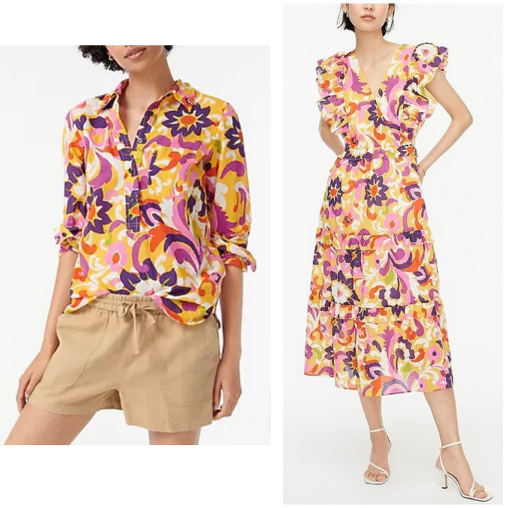 Made in Italy for JCrew, this is a wonderful opaque cotton woven, light weight with cottony crispness in the drape. The "artful blooms" design (32" repeat) features sunshine, deep grape, cherry, magenta, lime, pink and white (PANTONE 13-0942, 14-0226, 18-3518, 15-2718, 18-3324, 16-1451). Perfect for tailored shirt, dress, skirt, tunic, etc. If you would like to hand wash, please test first, and hang to dry, or dry clean.