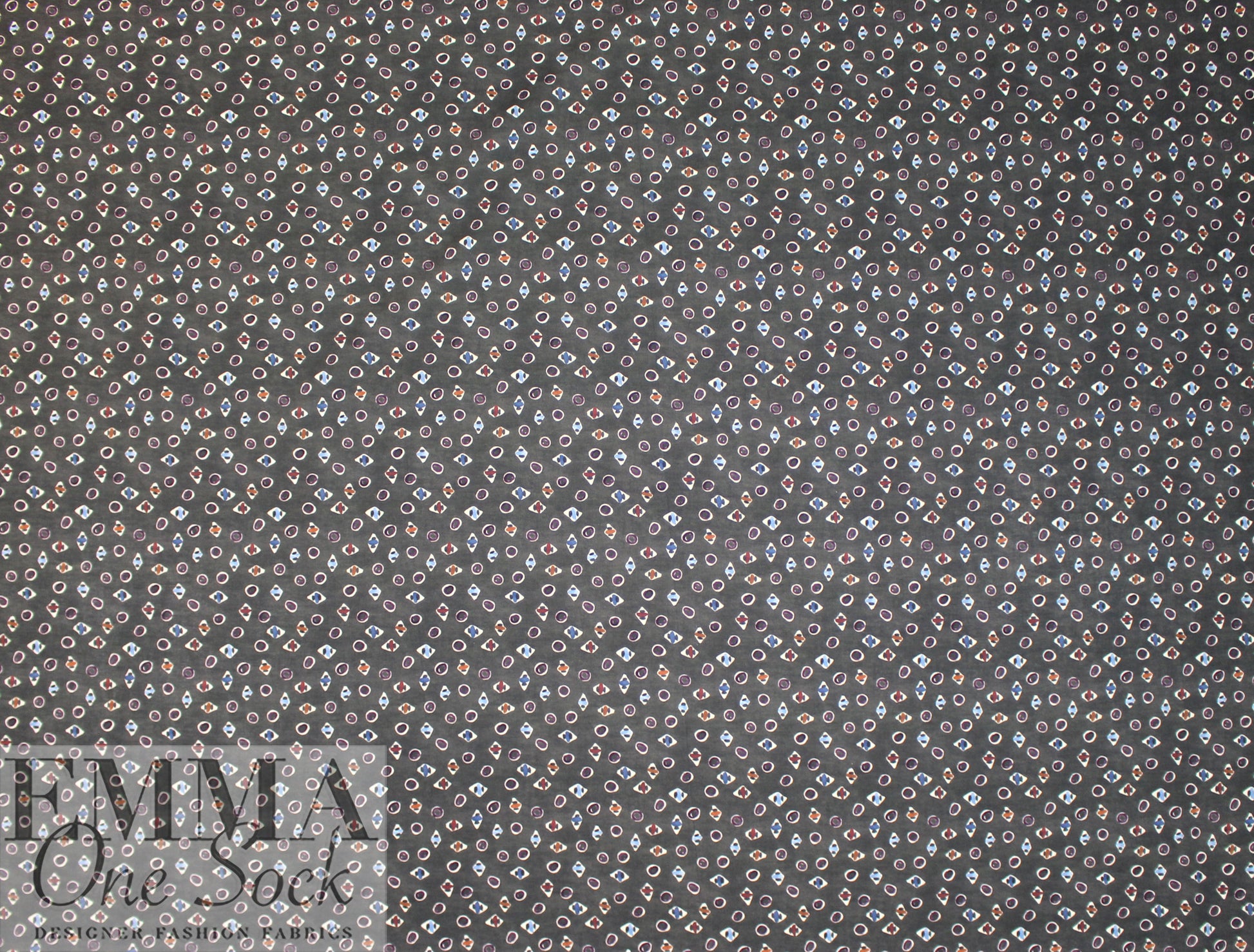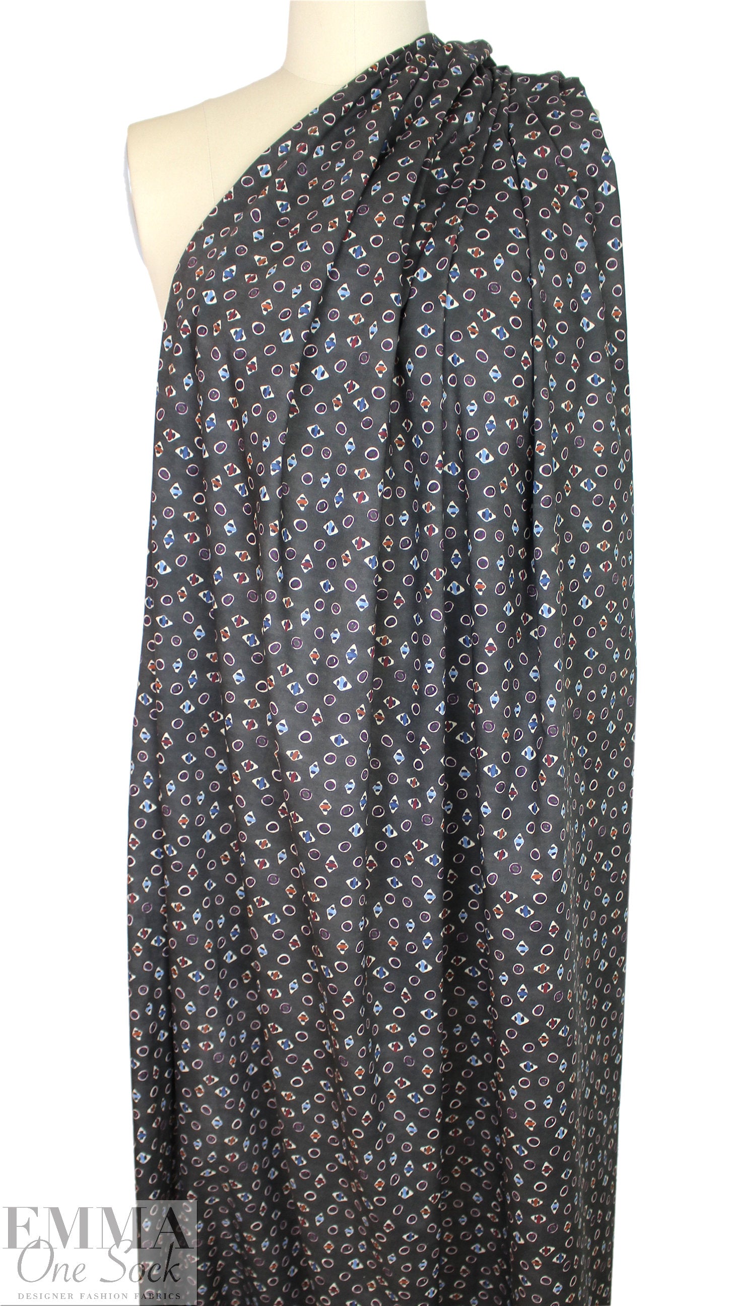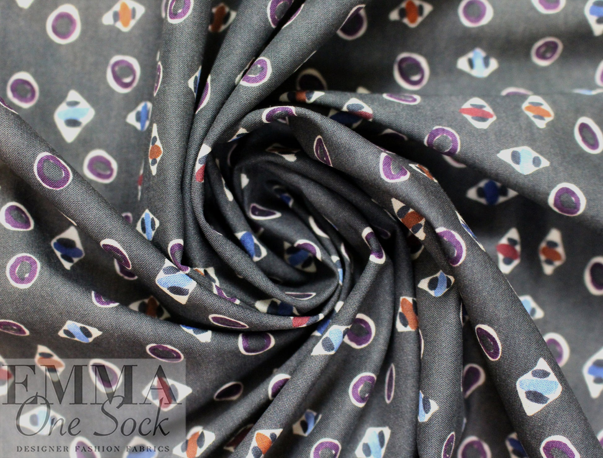Just in with a shipment from Italian mills, this is a fabulous designer Italian cotton woven shirting, light weight yet opaque, smooth and refined with some cottony crispness in the drape. The "tiny trinkets" print (8" repeat) features shades of nutmeg, raisin, denim and off white on a gunmetal gray background (PANTONE 19-3323, 16-4020, 18-1425, 18-5203). It is perfect for a men's or ladies' shirt, tunic, etc. Hand or machine wash gentle, and hang to dry (please test first), or dry clean.