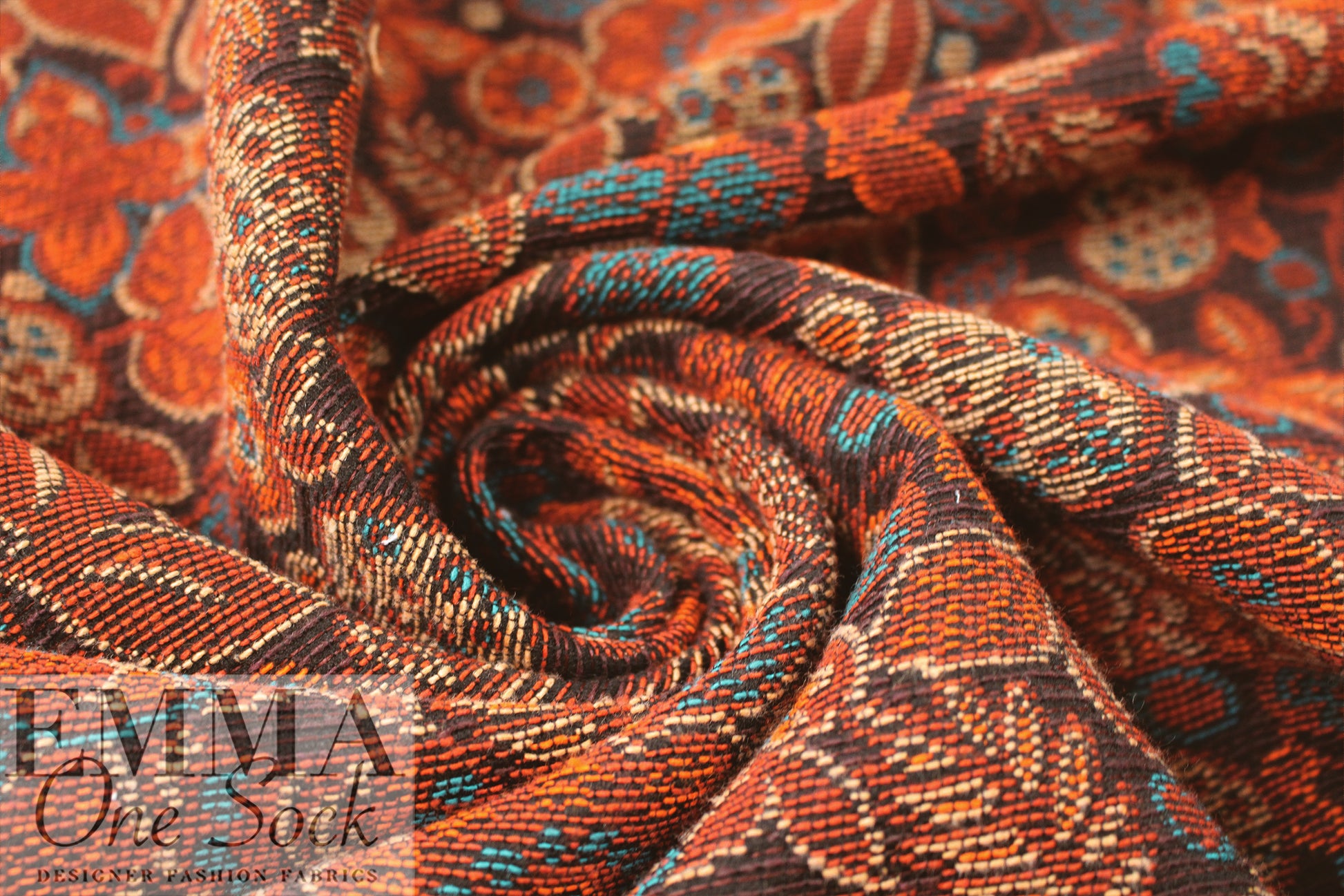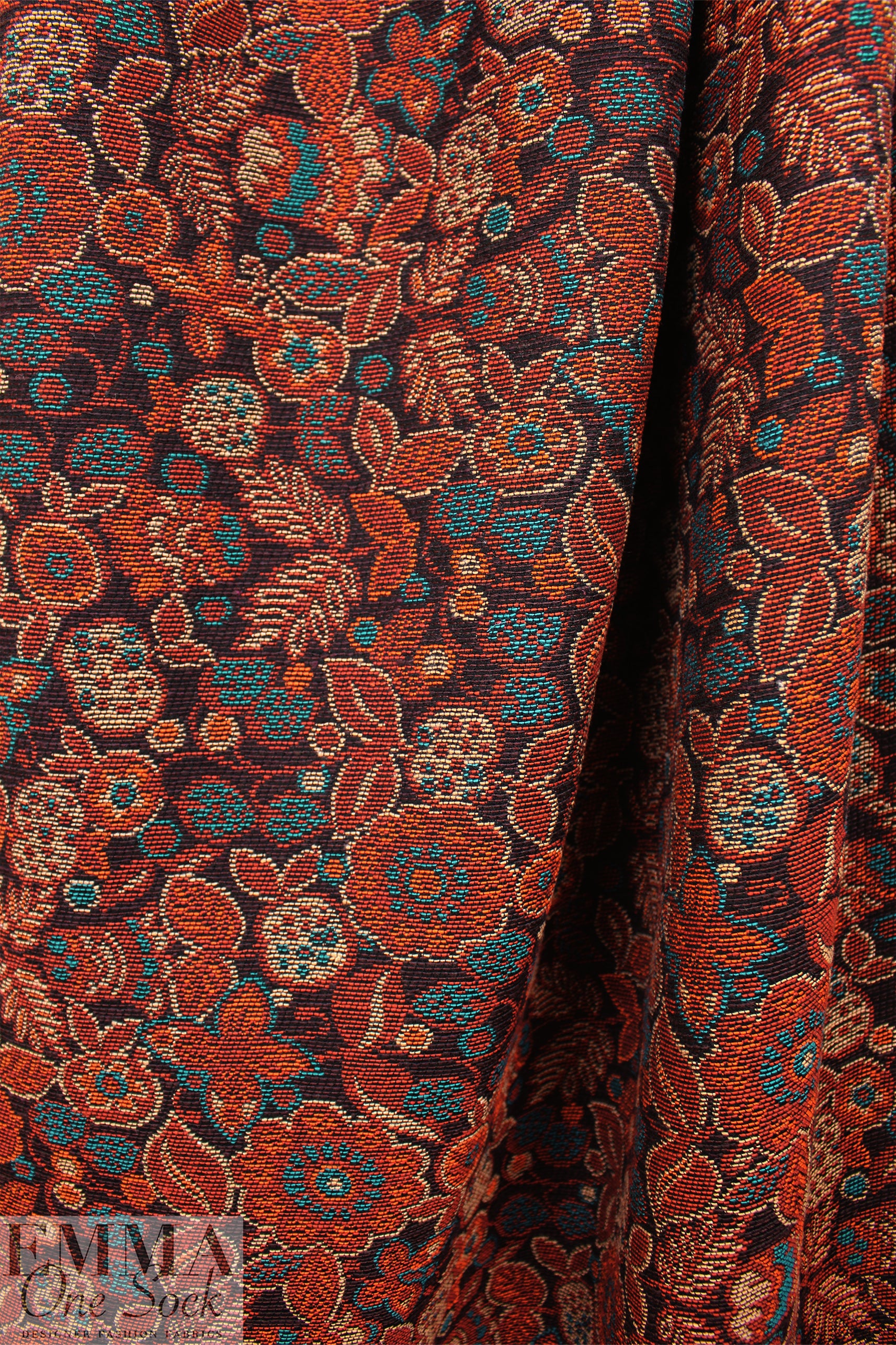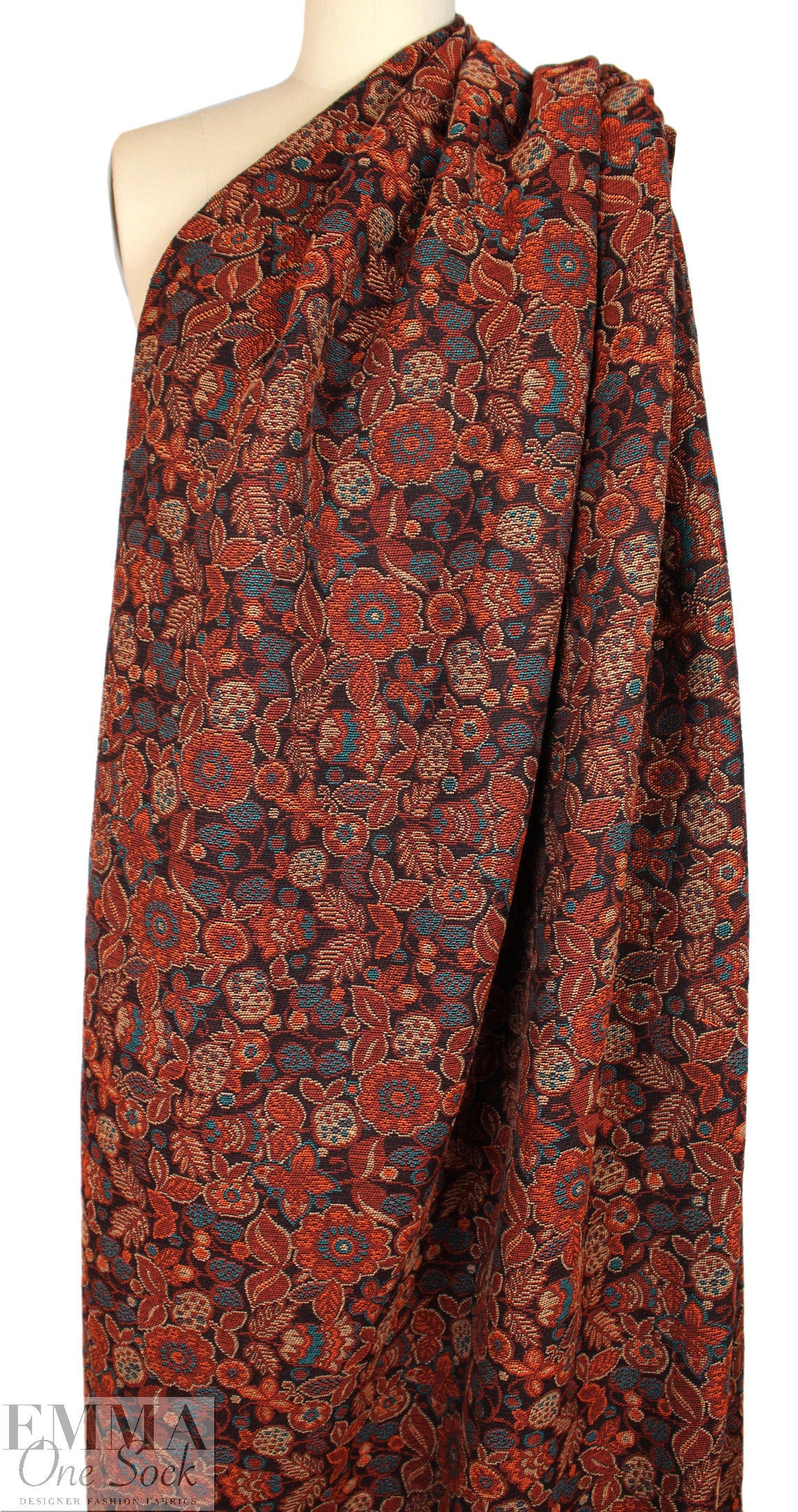 This is a lovely cotton blend tapestry fabric with a woven-in decorative floral design in shades of rust, teal, espresso, chili and khaki (PANTONE 19-1606, 18-1336, 17-4728, 14-1110, etc.). It is an opaque medium weight with a more firm yet malleable drape that is perfect for a fabulous topper coat or jacket. It is not waxy or overly stiff, but still could also be used to reupholster chairs, cushions, etc. Dry cleaning is best.