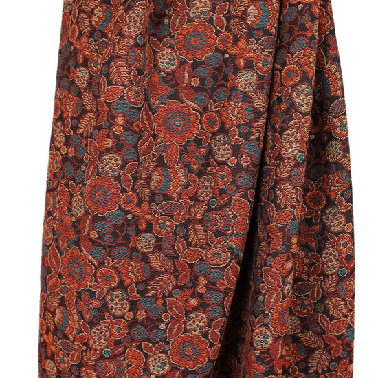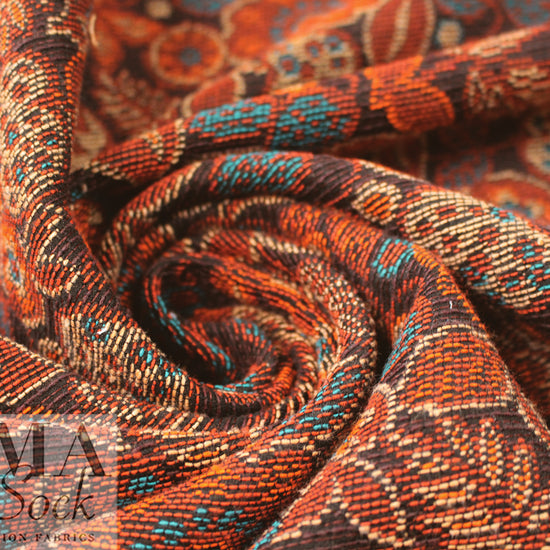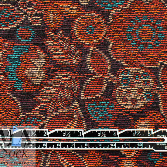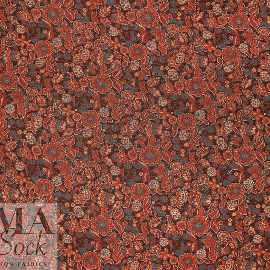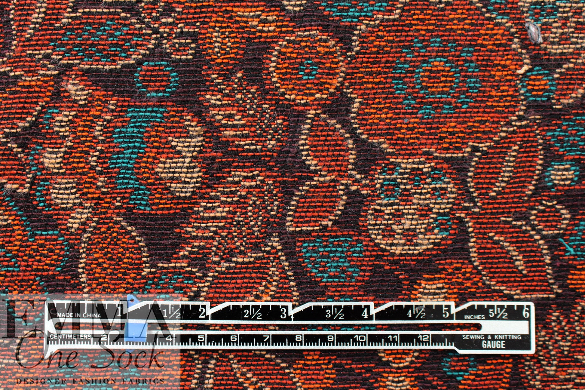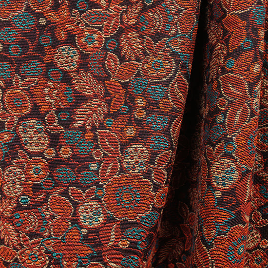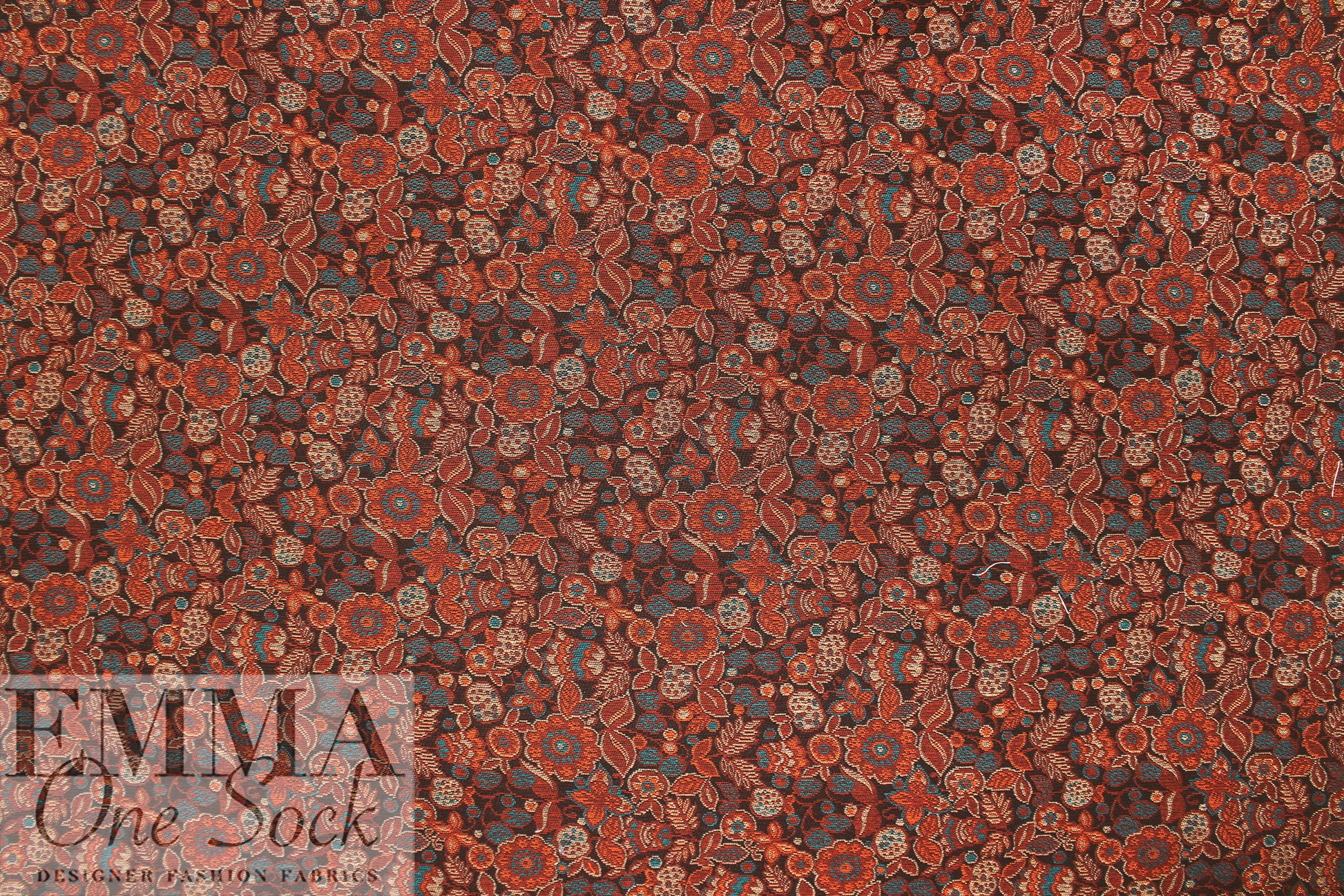 This is a lovely cotton blend tapestry fabric with a woven-in decorative floral design in shades of rust, teal, espresso, chili and khaki (PANTONE 19-1606, 18-1336, 17-4728, 14-1110, etc.). It is an opaque medium weight with a more firm yet malleable drape that is perfect for a fabulous topper coat or jacket. It is not waxy or overly stiff, but still could also be used to reupholster chairs, cushions, etc. Dry cleaning is best.
