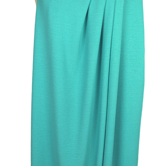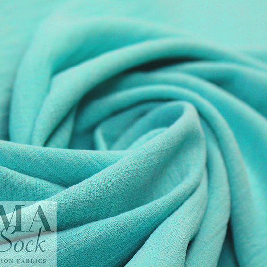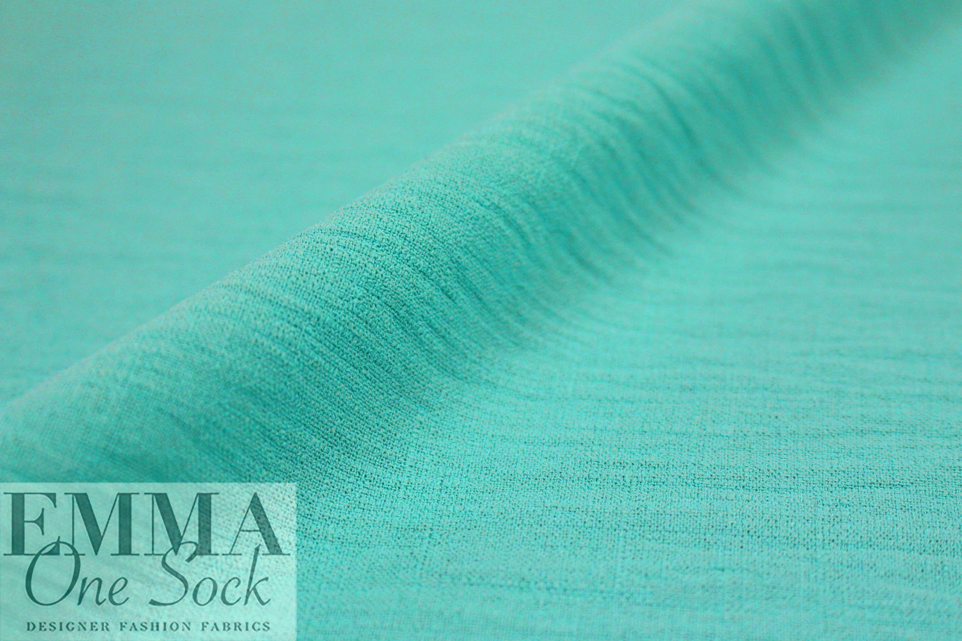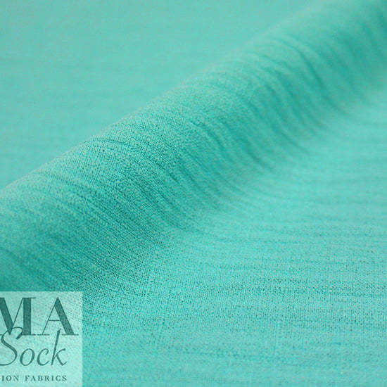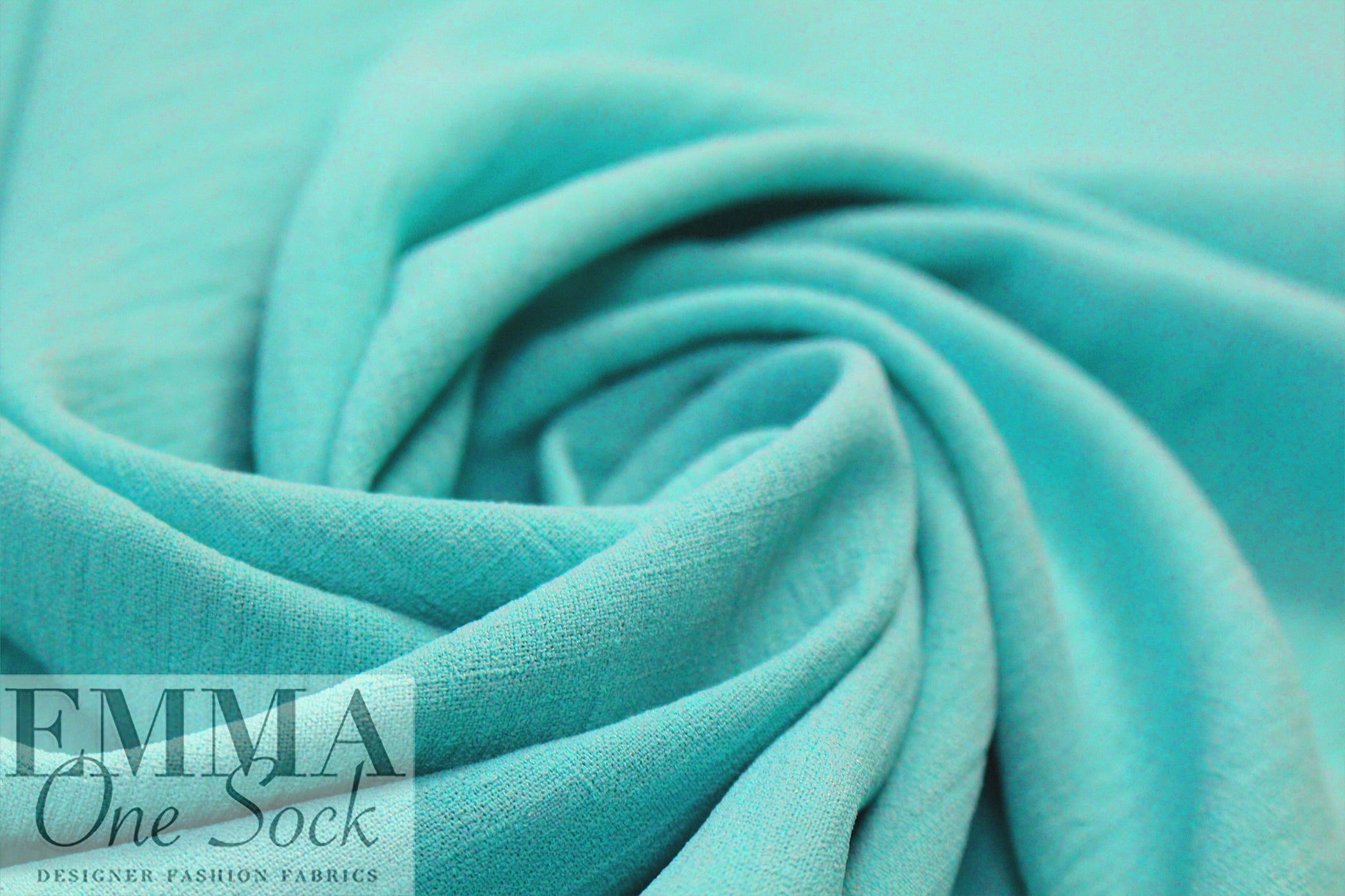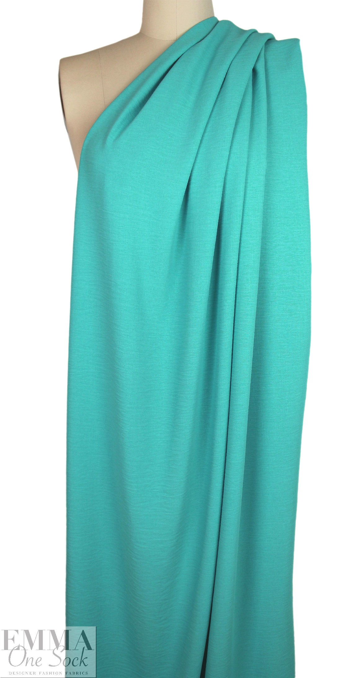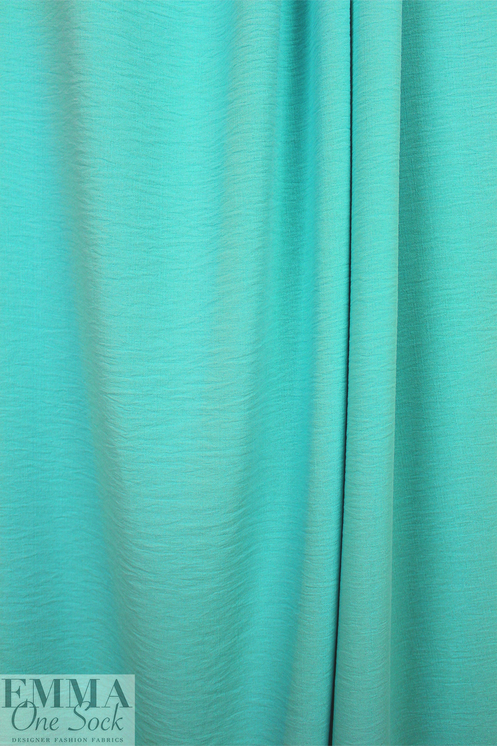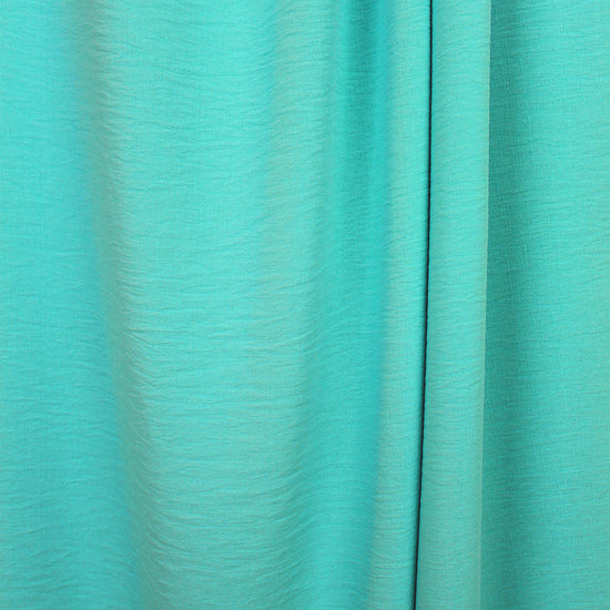 This is a lovely slight crinkle-textured polyester woven, lightweight and nearly opaque with a soft drape. The color is a light turquoise tone called capri (PANTONE 15-4722) and it's a delightful and economical choice for warmer weather tops, blouses, shirts, tunics, etc. Hand or machine wash, hang to dry (please test first), or dry clean.