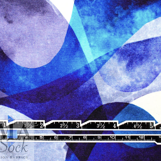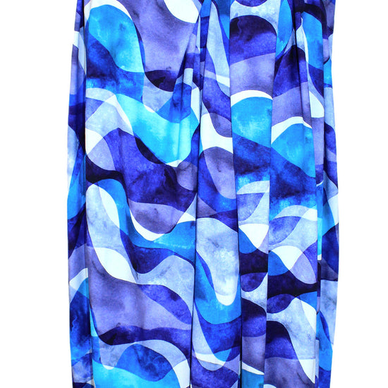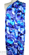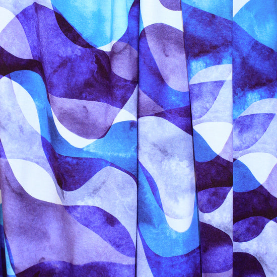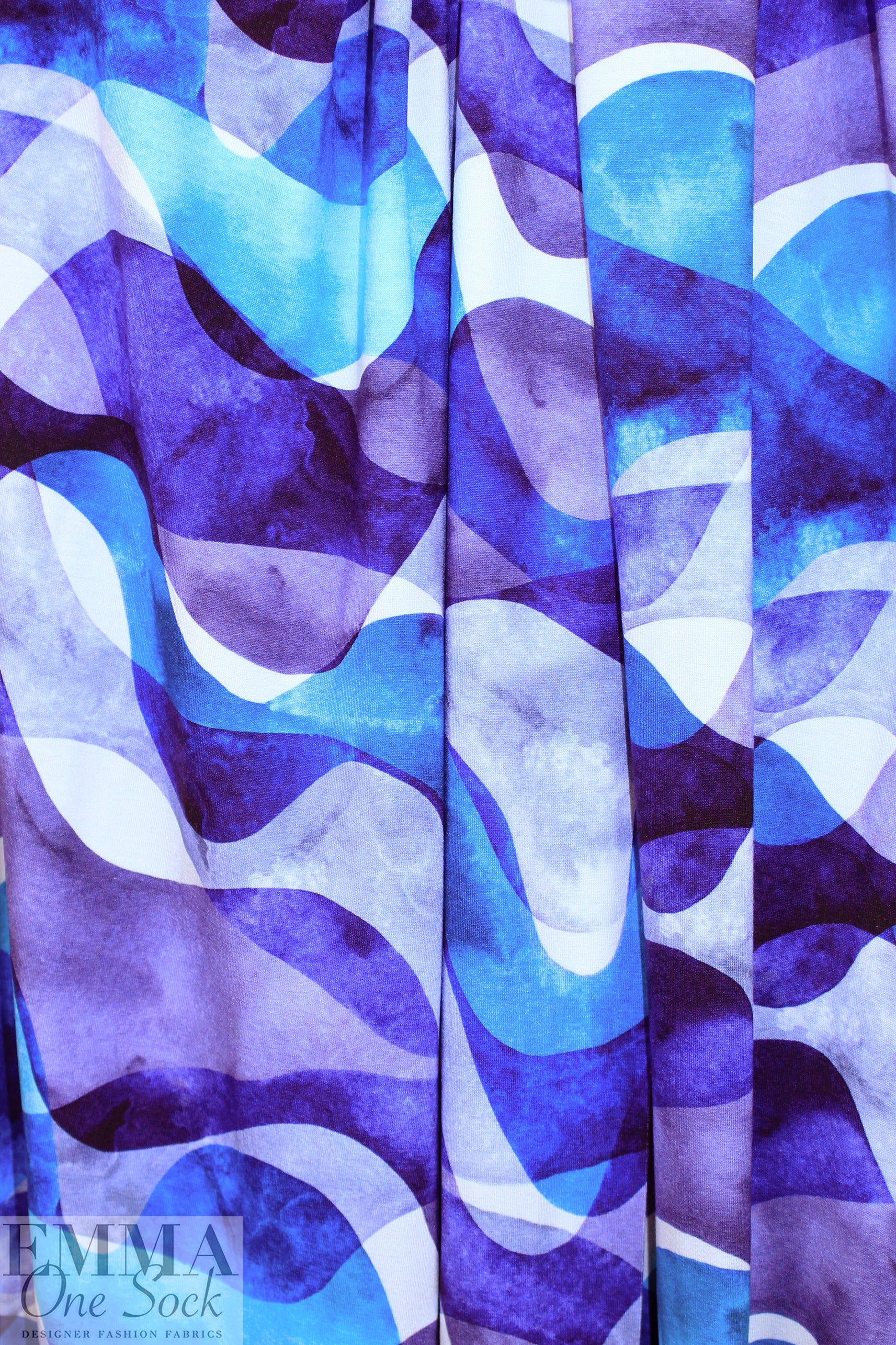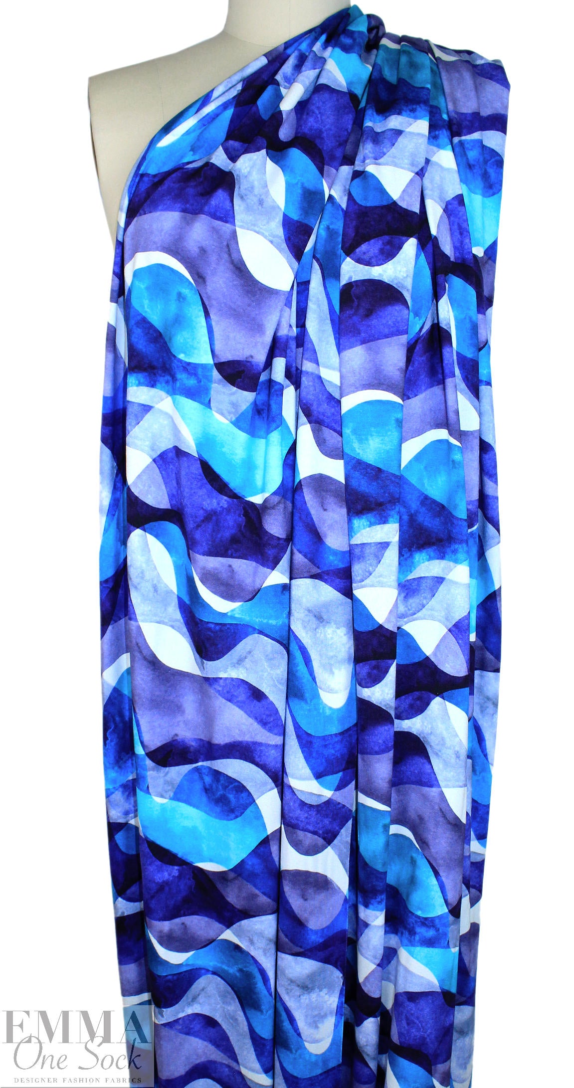 This is a VISCOSE/spandex print imported from The Netherlands! First, the quality of the fabric is excellent, soft and drapey, with about 50% stretch in the width. It is lightweight yet opaque and has a soft hand and a matte finish. It is Oeko-Tex certified for non-toxic chemicals and dyes. The "blue tide" print has a 13.5" repeat, and features navy, aqua, indigo, dusty blue, midnight and white tones (PANTONE 16-3920, 15-4421, 19-3950, 18-3943, etc.). Make a great tee, top, tunic, skirt, dress, etc. The manufacturer recommends hand or machine wash warm, hang to dry. Please test first.