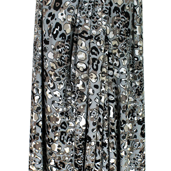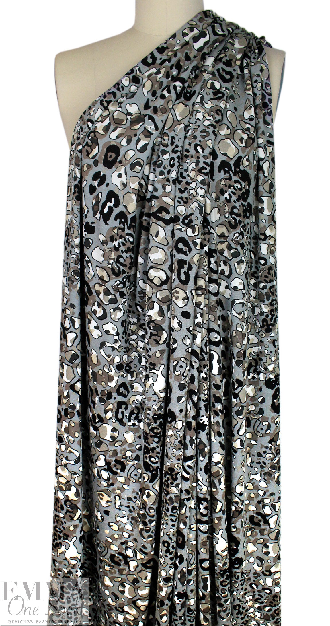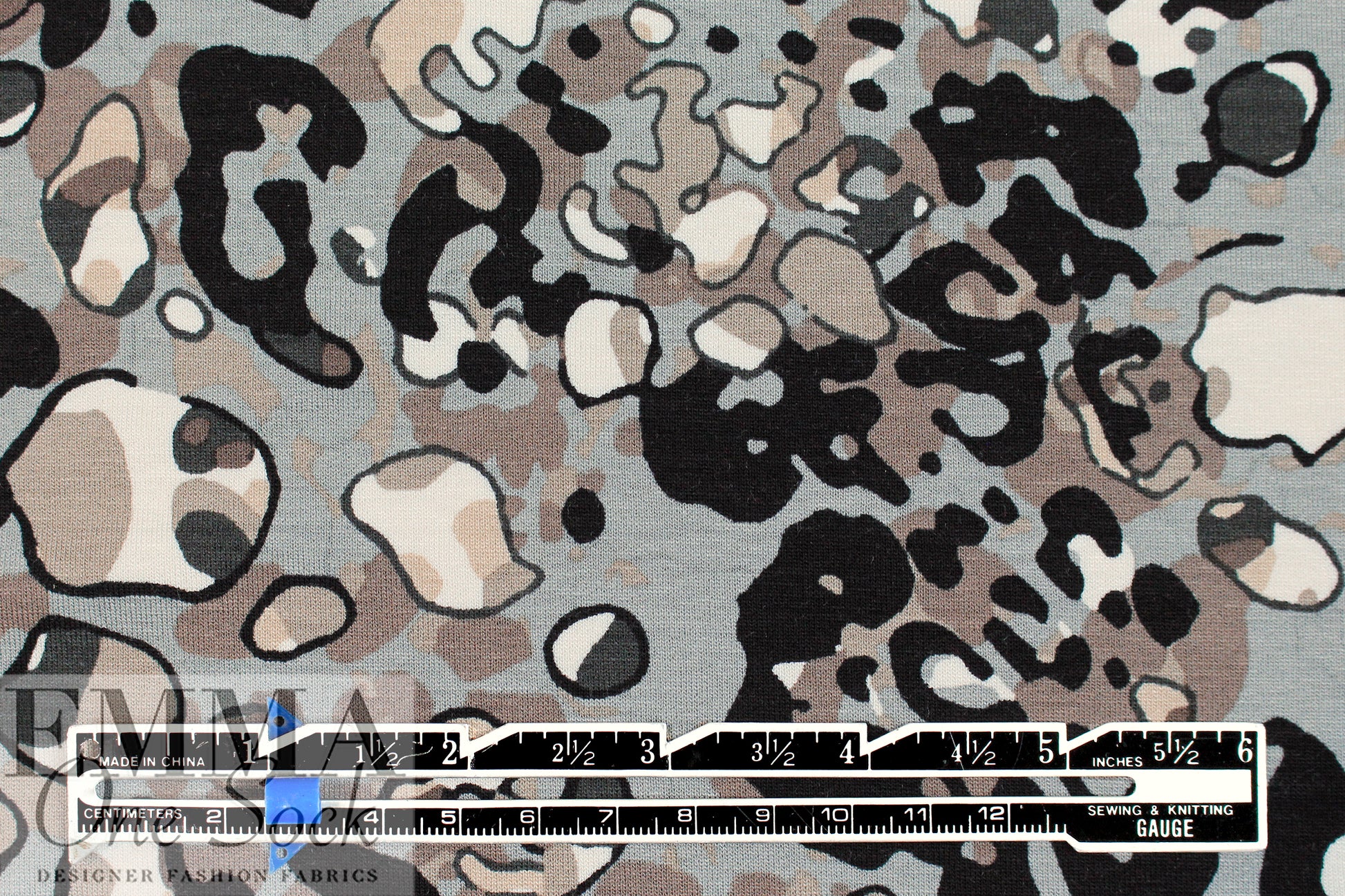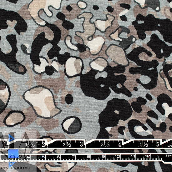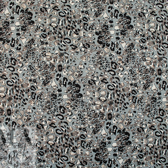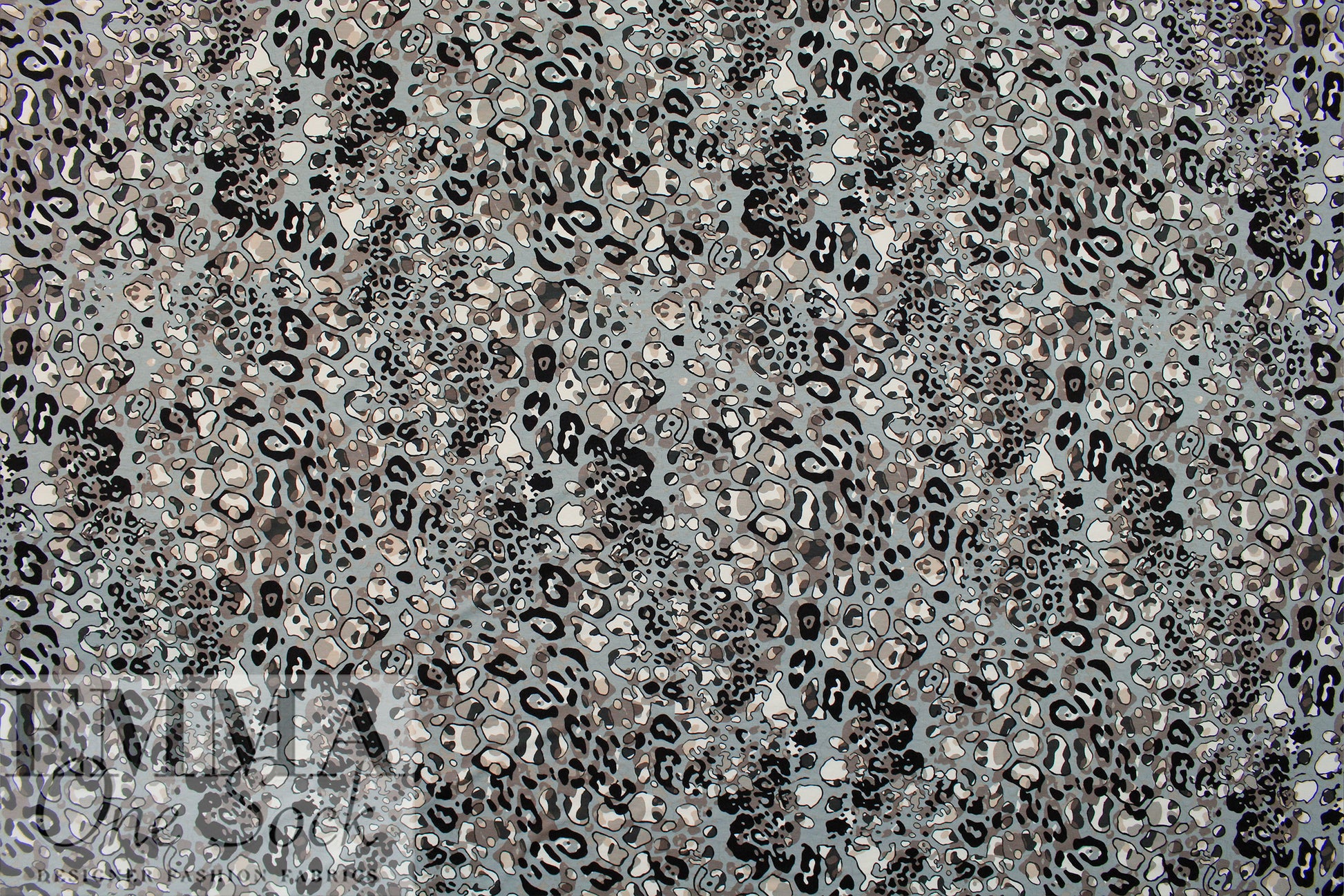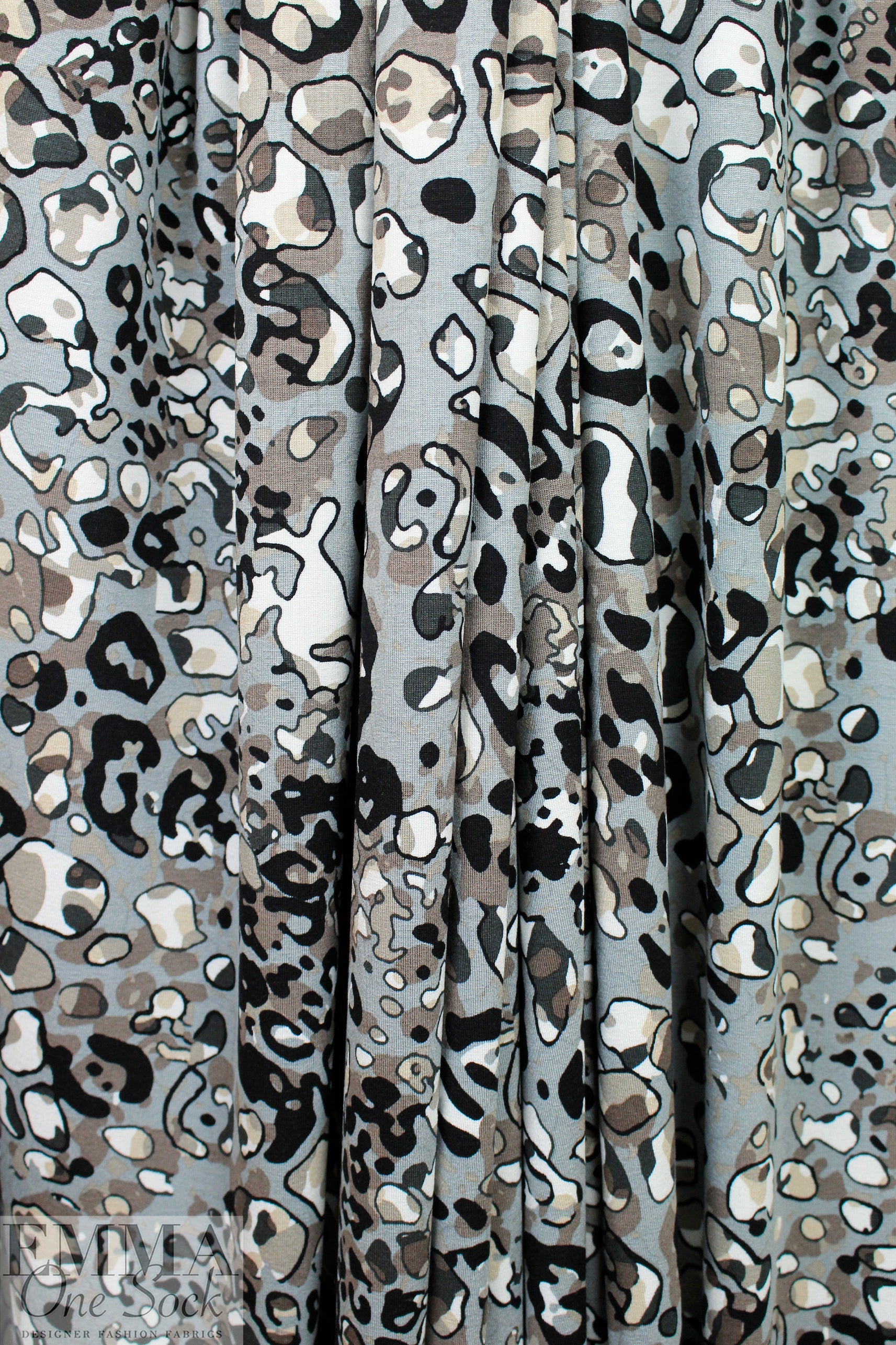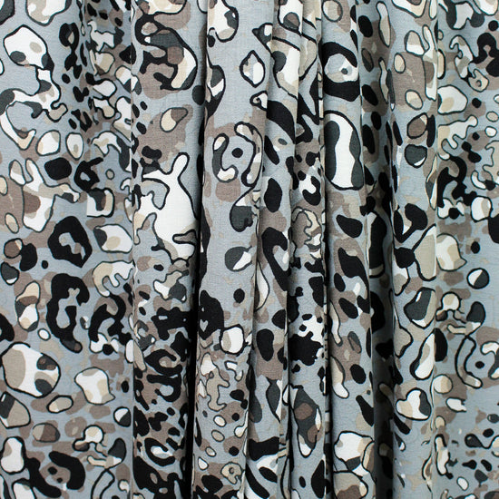 This is a fabulous viscose/spandex 4-way stretch knit, lightweight yet opaque, with lovely drape. The stylized animal print (22.75" repeat) features driftwood, mocha, black white and light gray (PANTONE 18-1112, 16-0000, 18-0503, 13-1106, etc.). 50% stretch in the width, 25% in the length, with great recovery. It is Oeko-Tex certified for non-toxic chemicals and dyes. Great for tees, tops, tunics, dresses, etc. Beautiful quality! Test first if you would like to hand or machine wash, and hang to dry. 1.75 yds.